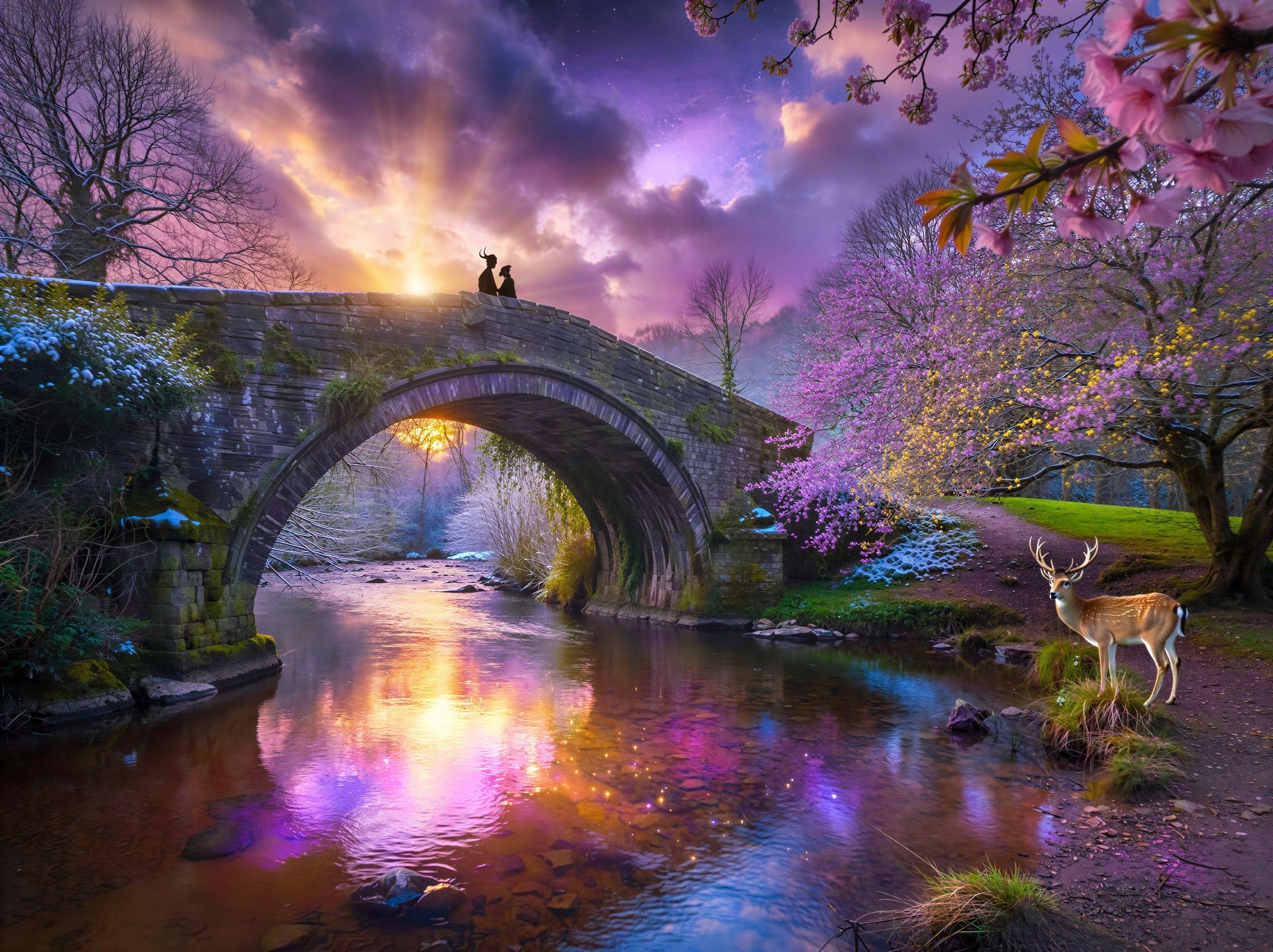 An enchanting painting depicts a majestic arched stone bridge spanning a serene river, with the sun setting behind it. The sky is streaked with vibrant hues of purple, orange, and yellow, creating a romantic atmosphere. On the crest of the bridge, two figures with horns, one larger and one smaller,