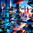 A vibrant futuristic cityscape features towering skyscrapers intertwined with lush greenery. Neon lights illuminate the structures, while clouds and a colorful sky create a breathtaking atmosphere.