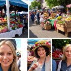 The image features a vibrant market scene with colorful stands of fruits and vegetables. There are smiling individuals in a collage, showcasing diversity amidst the lively atmosphere.