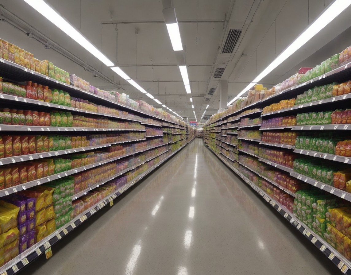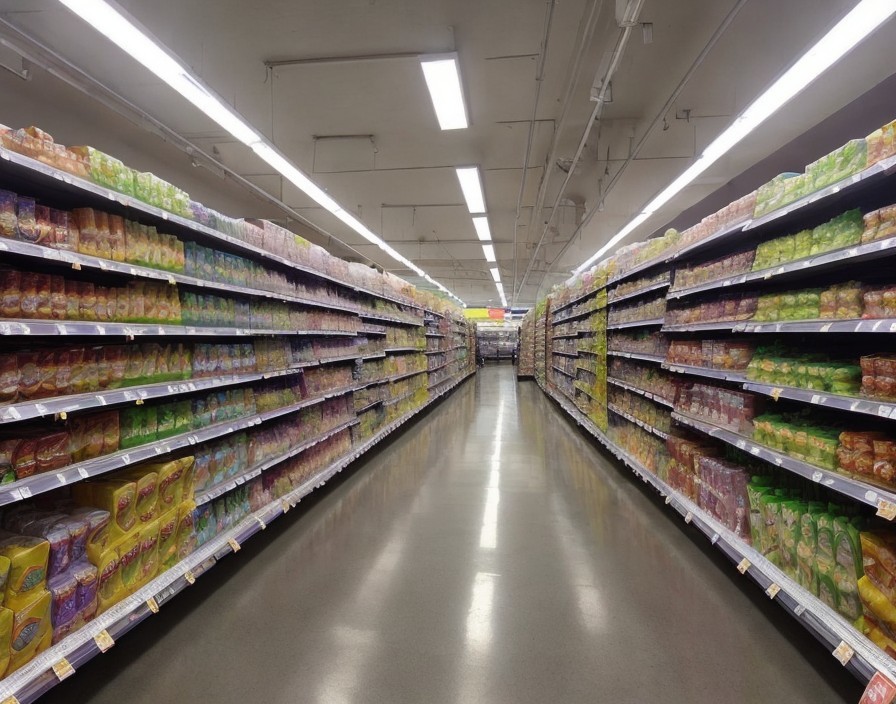 Supermarket Aisle with Stocked Shelves and Bright Lights