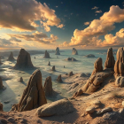 A breathtaking landscape featuring towering rock formations, rolling clouds, and a vast, misty expanse. The scene captures the beauty of nature with vibrant colors and dramatic lighting.