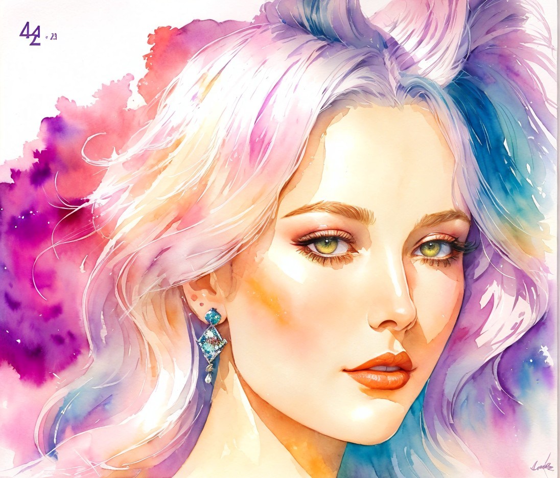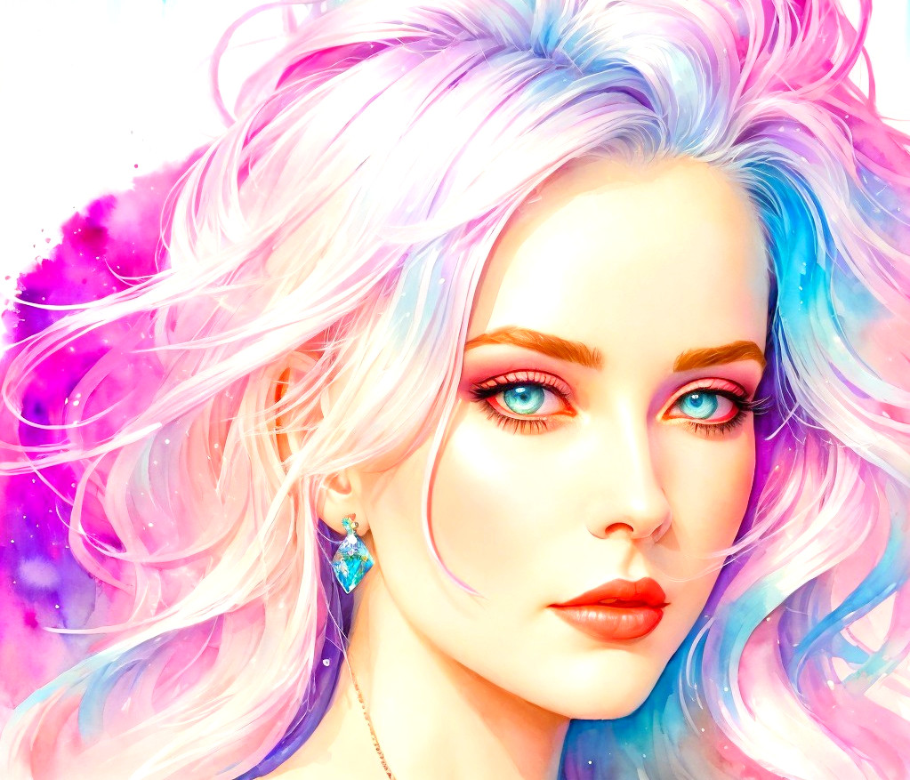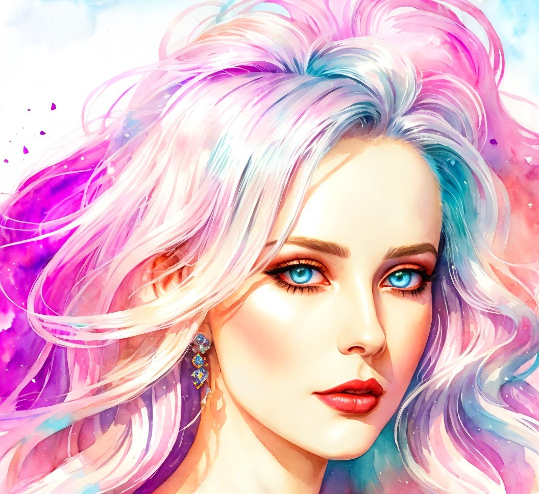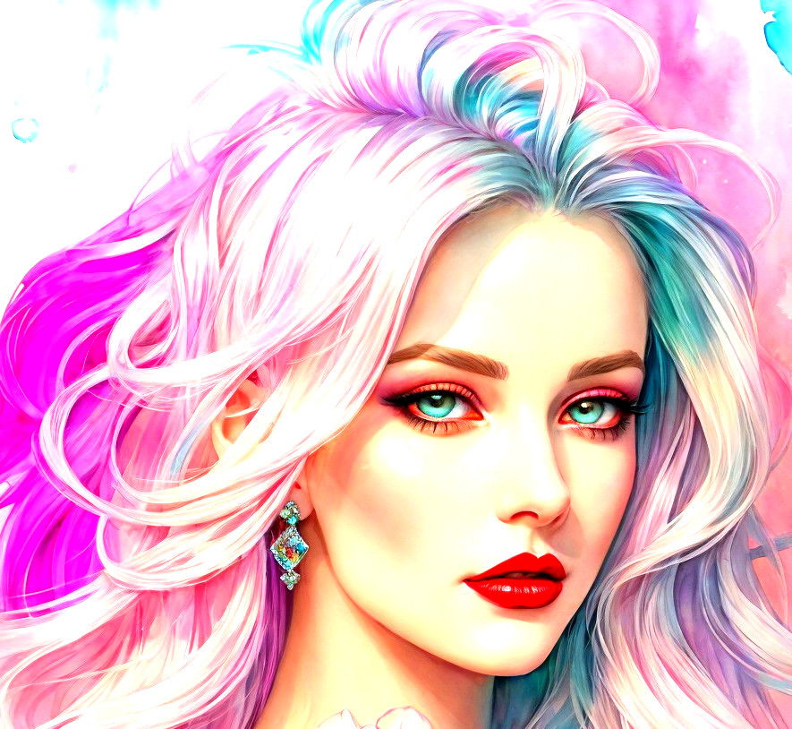 A digital artwork of a woman with multicolored hair and blue eyes, featuring a cosmic motif and vibrant colors.
