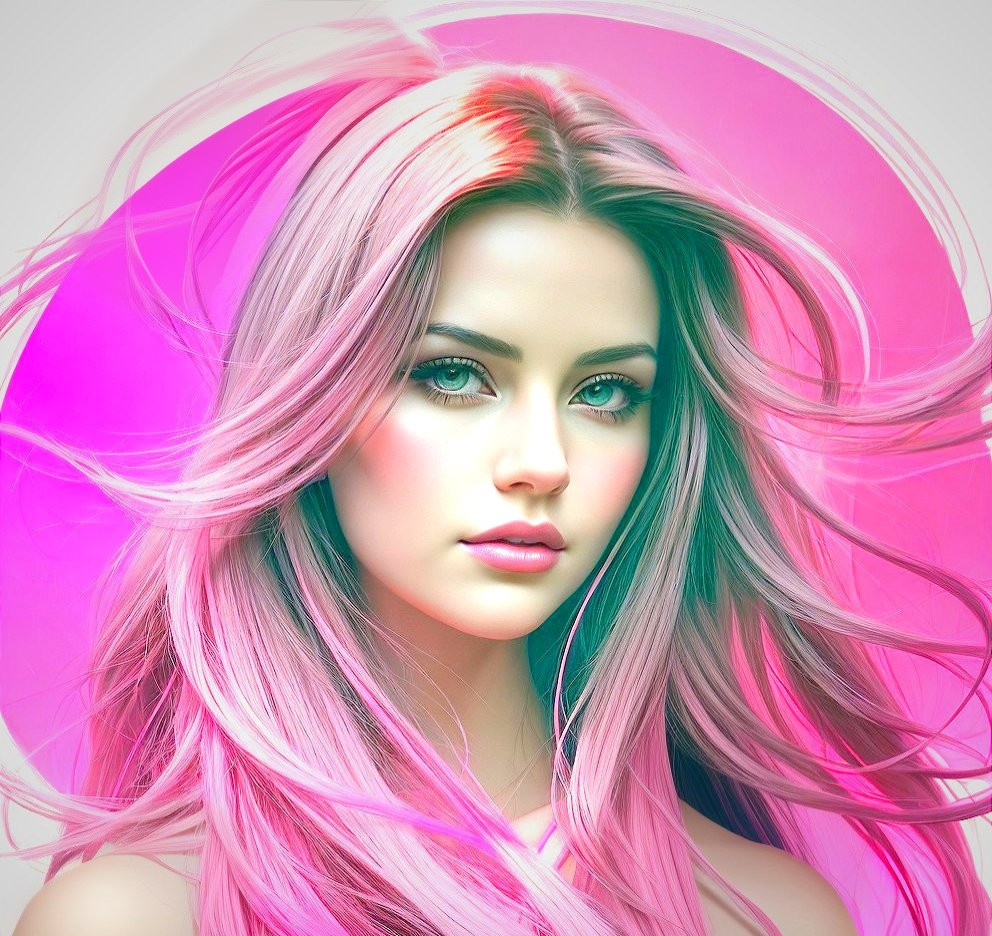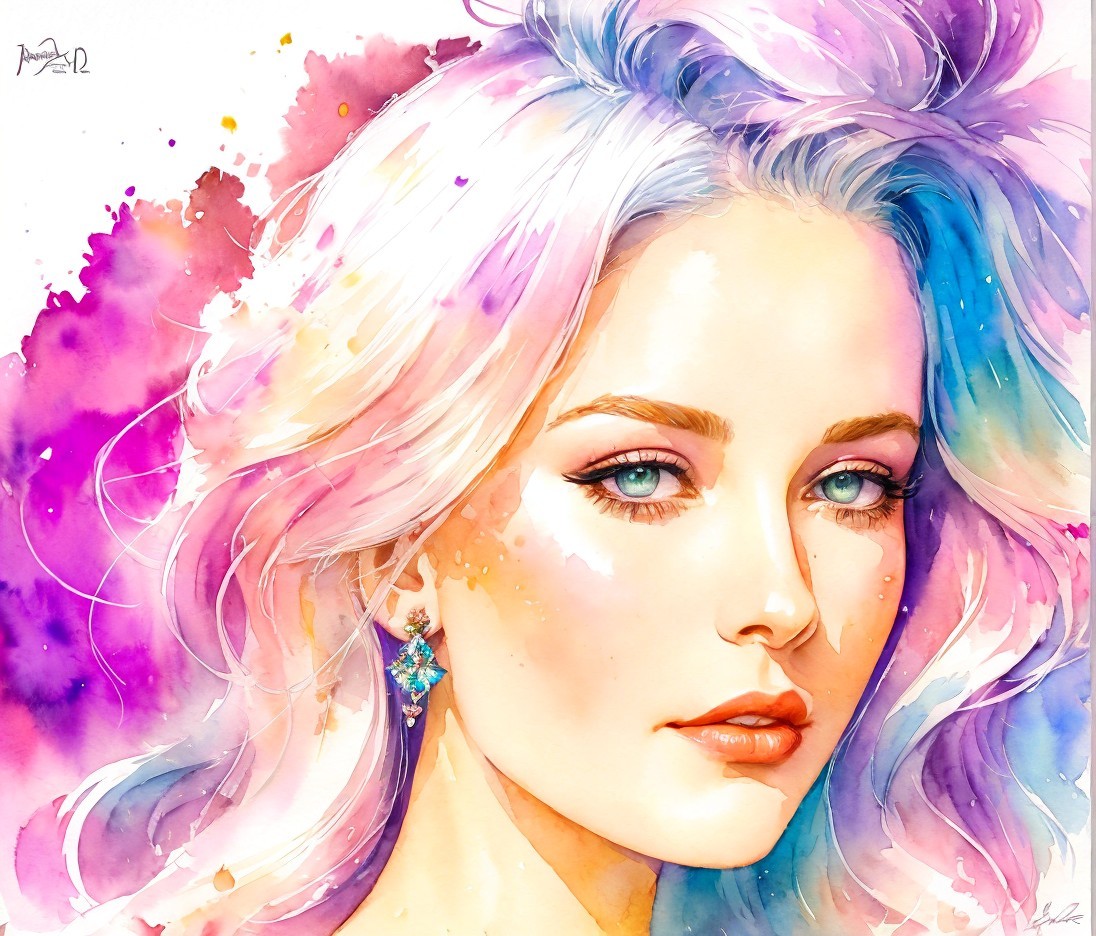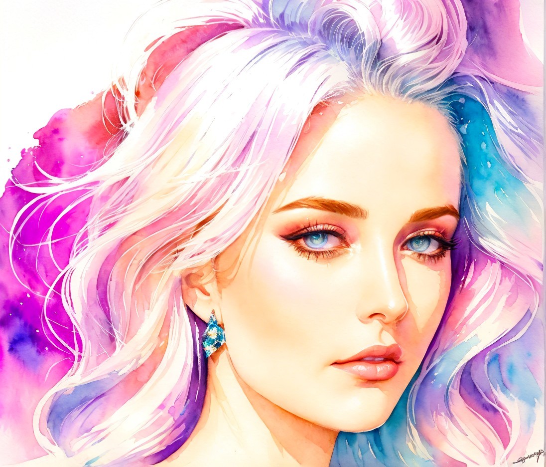 A digital artwork of a woman with multicolored hair and blue eyes, featuring a cosmic motif and vibrant colors.