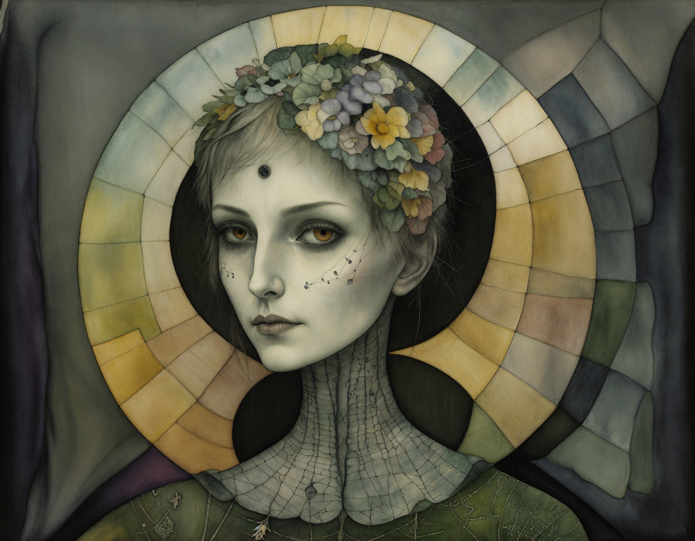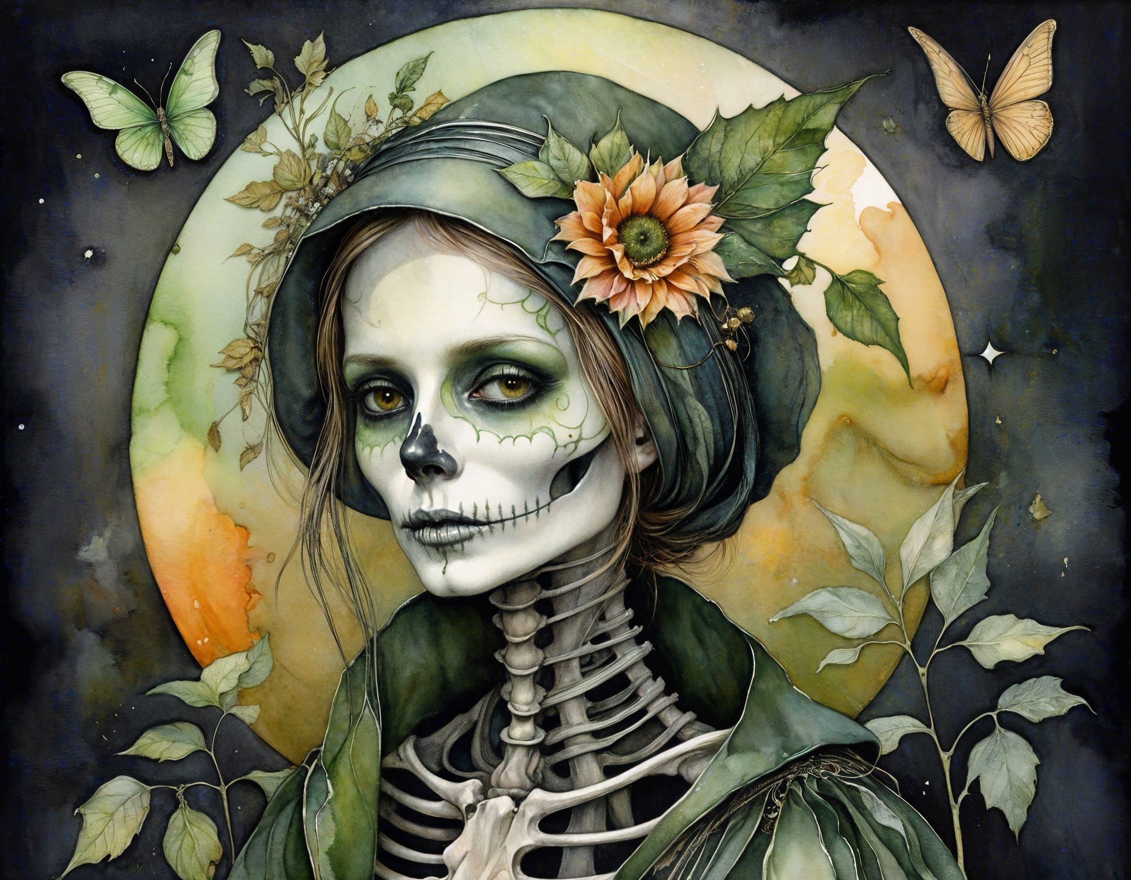 A hauntingly beautiful skeleton witch with sunflowers in her hat gazes intently. Surrounded by delicate butterflies and moonlit foliage, she embodies a blend of magic and mystery.