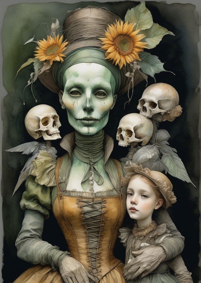A ethereal figure with a pale, greenish complexion, wearing a historical dress and a wide-brimmed hat adorned with sunflowers, exudes a mystical aura against a dark, lush background.