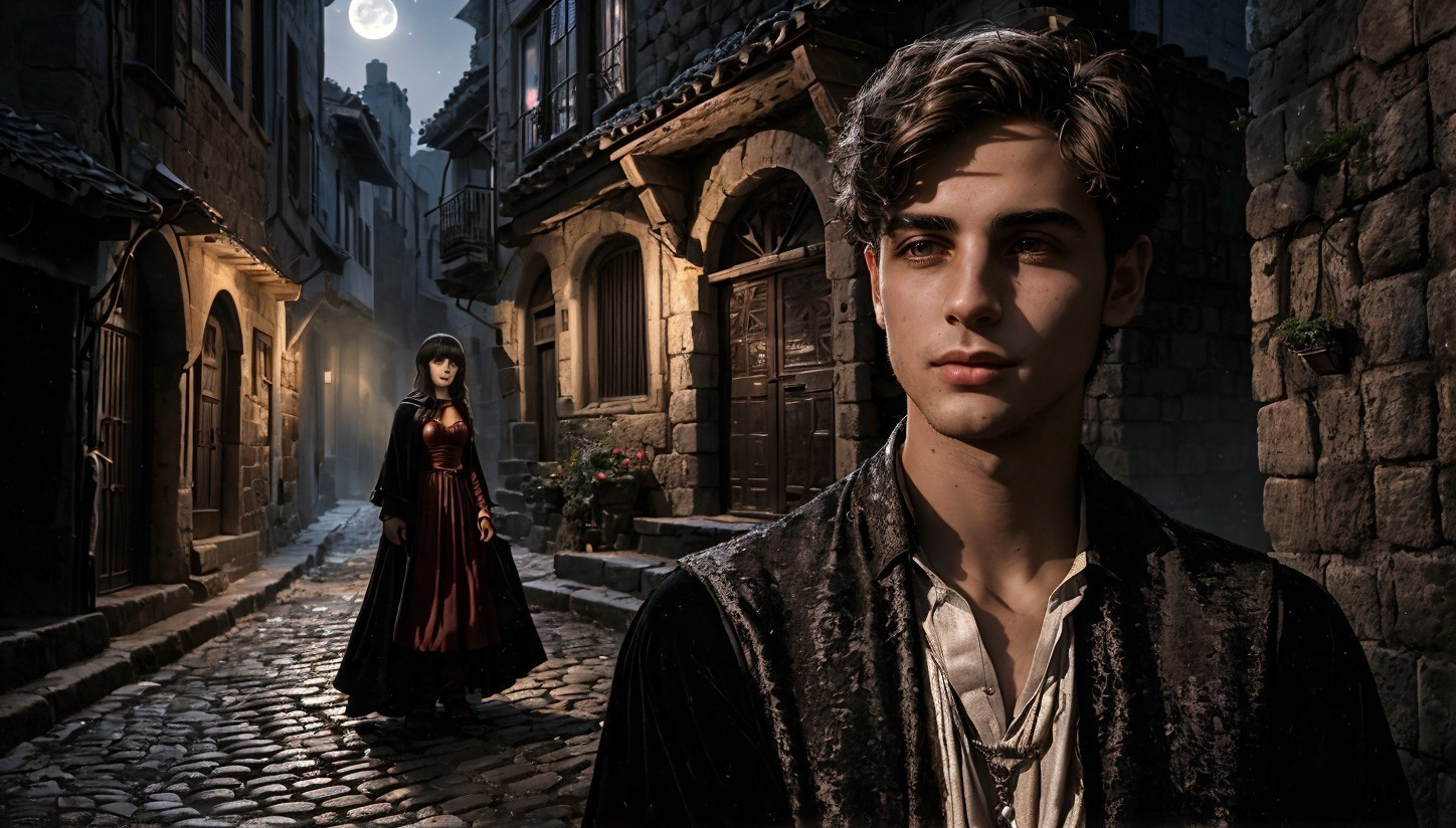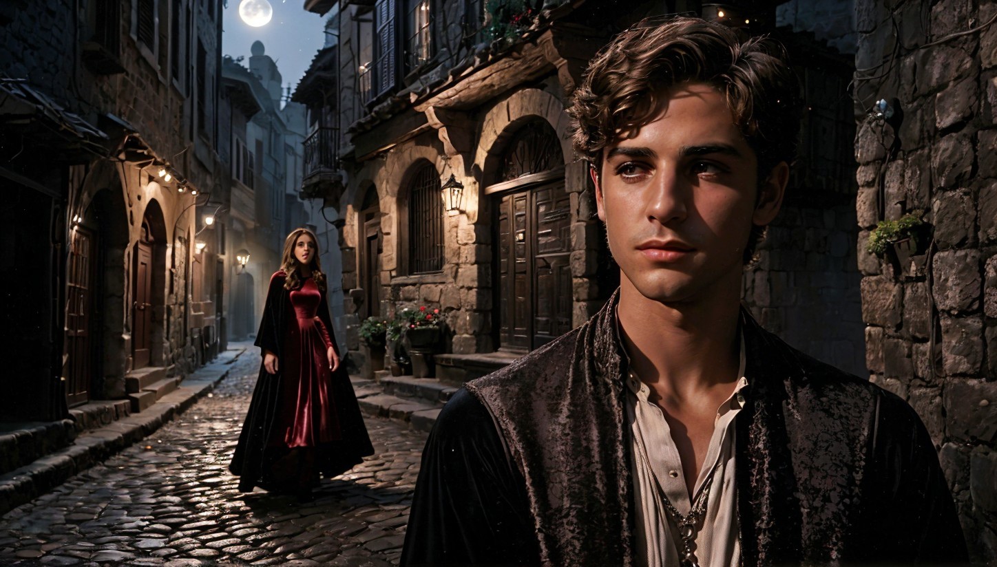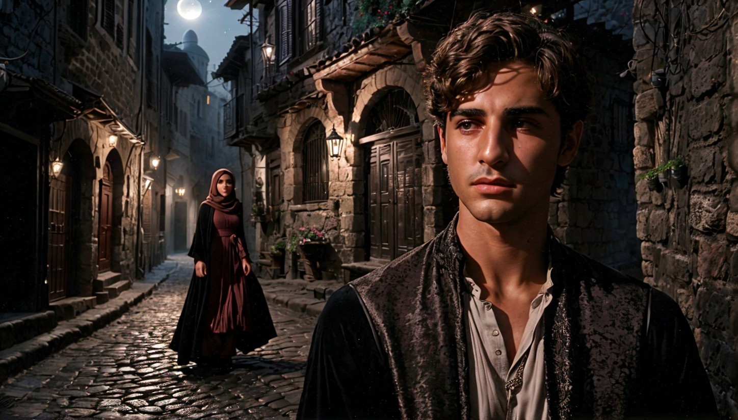 A young man in the foreground with a contemplative expression, and a woman in an ancient street under moonlight in the background.
