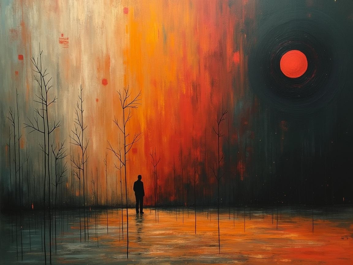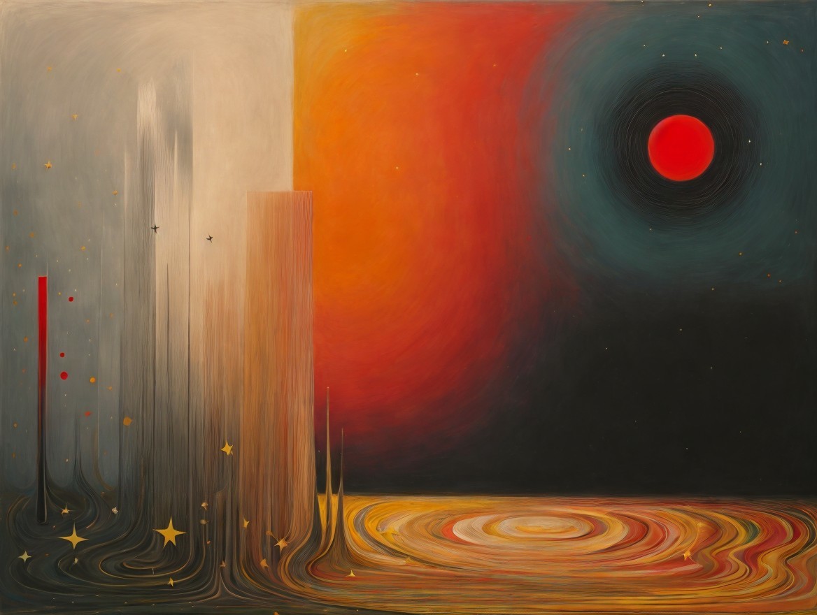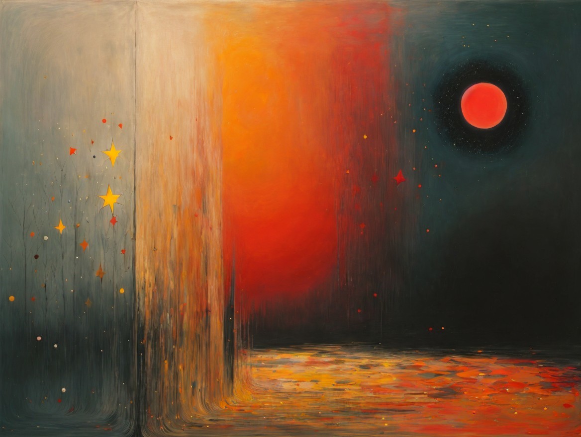 The image features a striking abstract landscape, divided into contrasting halves: one side with swirling warm tones of red and orange, the other cool greys and blacks, evoking a cosmic or dreamlike atmosphere.