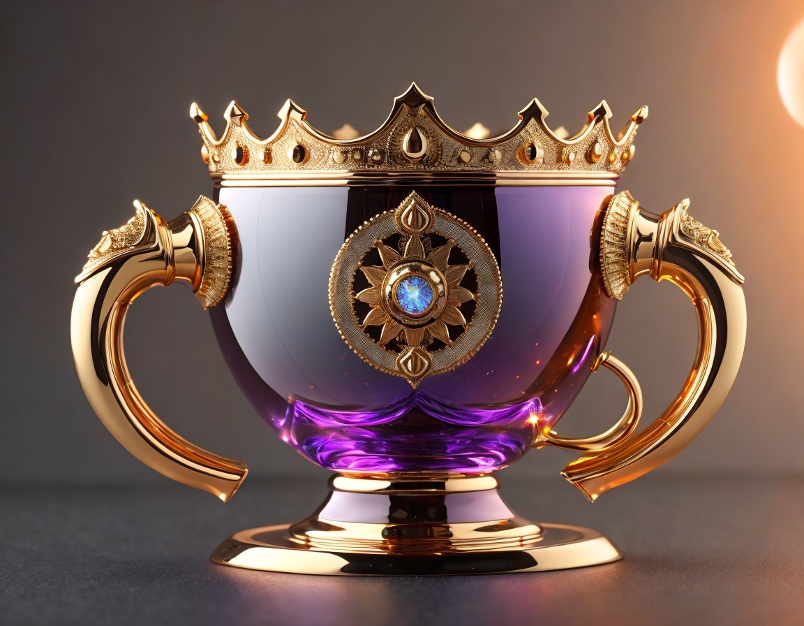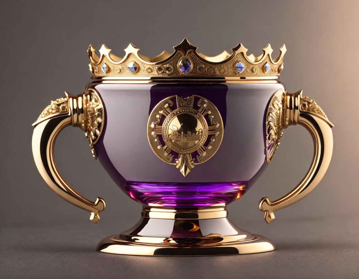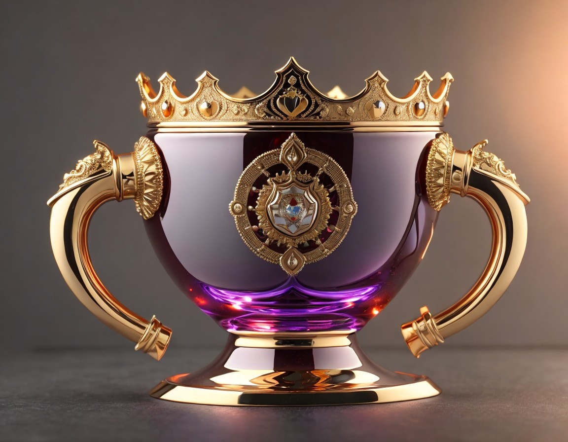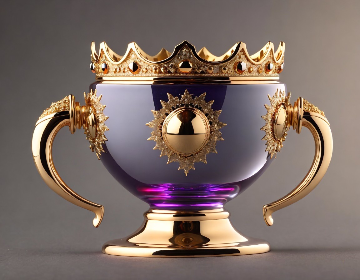 This elegant cup features a rich purple body adorned with ornate golden accents and a crown-like rim. The design includes decorative jewels, evoking a regal and luxurious look.
