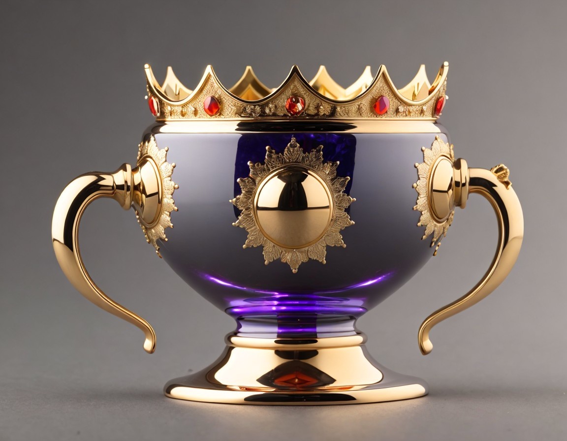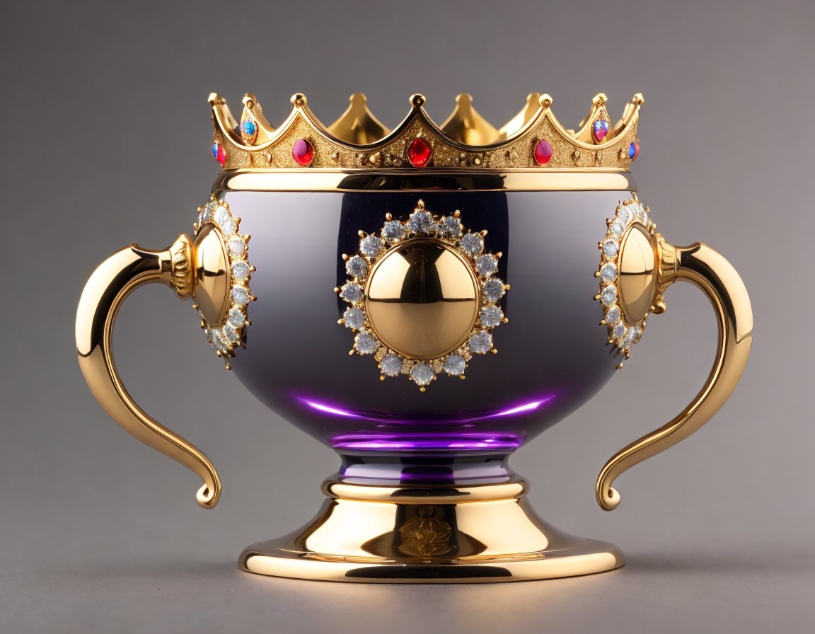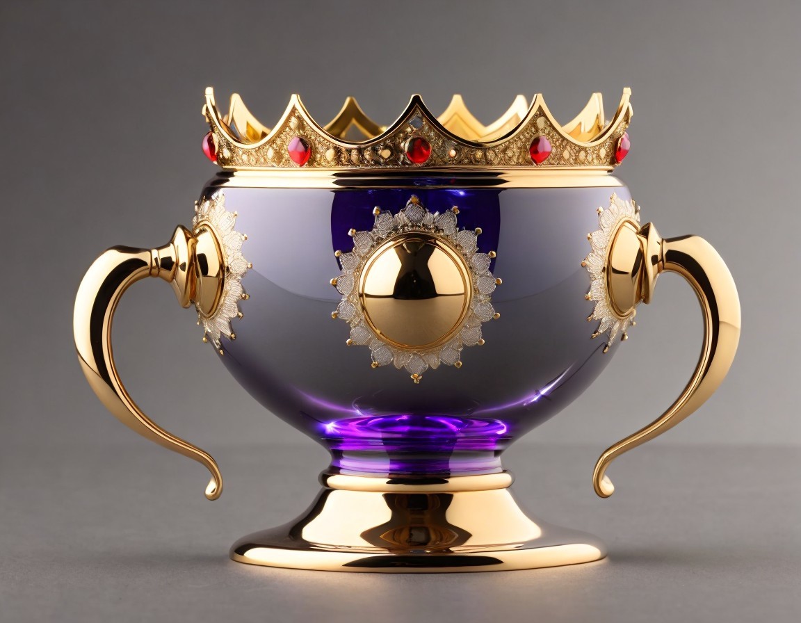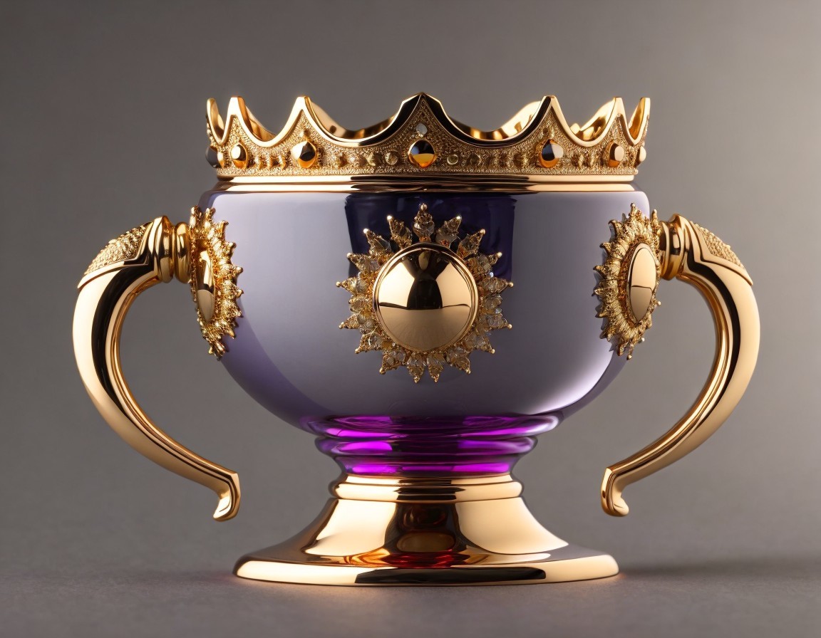 This elegant cup features a rich purple body adorned with ornate golden accents and a crown-like rim. The design includes decorative jewels, evoking a regal and luxurious look.