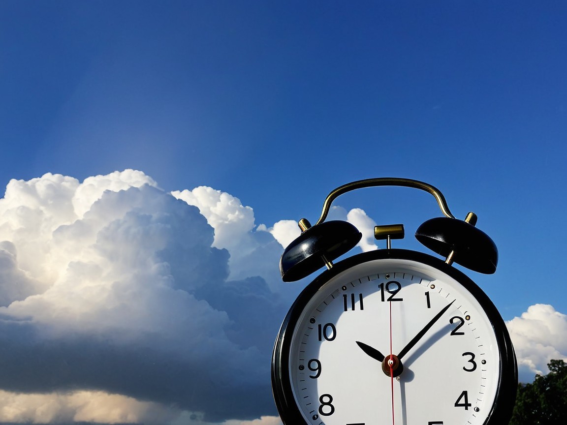 A vintage alarm clock stands in the foreground against a vibrant sky. Rays of sunlight burst through fluffy clouds, creating a serene and hopeful atmosphere. Birds soar in the distance.