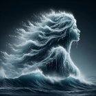 A figure in a reflective bodysuit emerges dramatically from crashing ocean waves, surrounded by foamy blue water, evoking a sense of mystique and power in a turbulent seascape.
