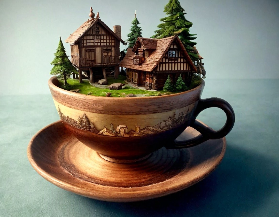 A whimsical arrangement of tiny wooden houses nestled among lush green trees, all creatively set within two stacked wooden cups, creating a cozy, enchanting scene.