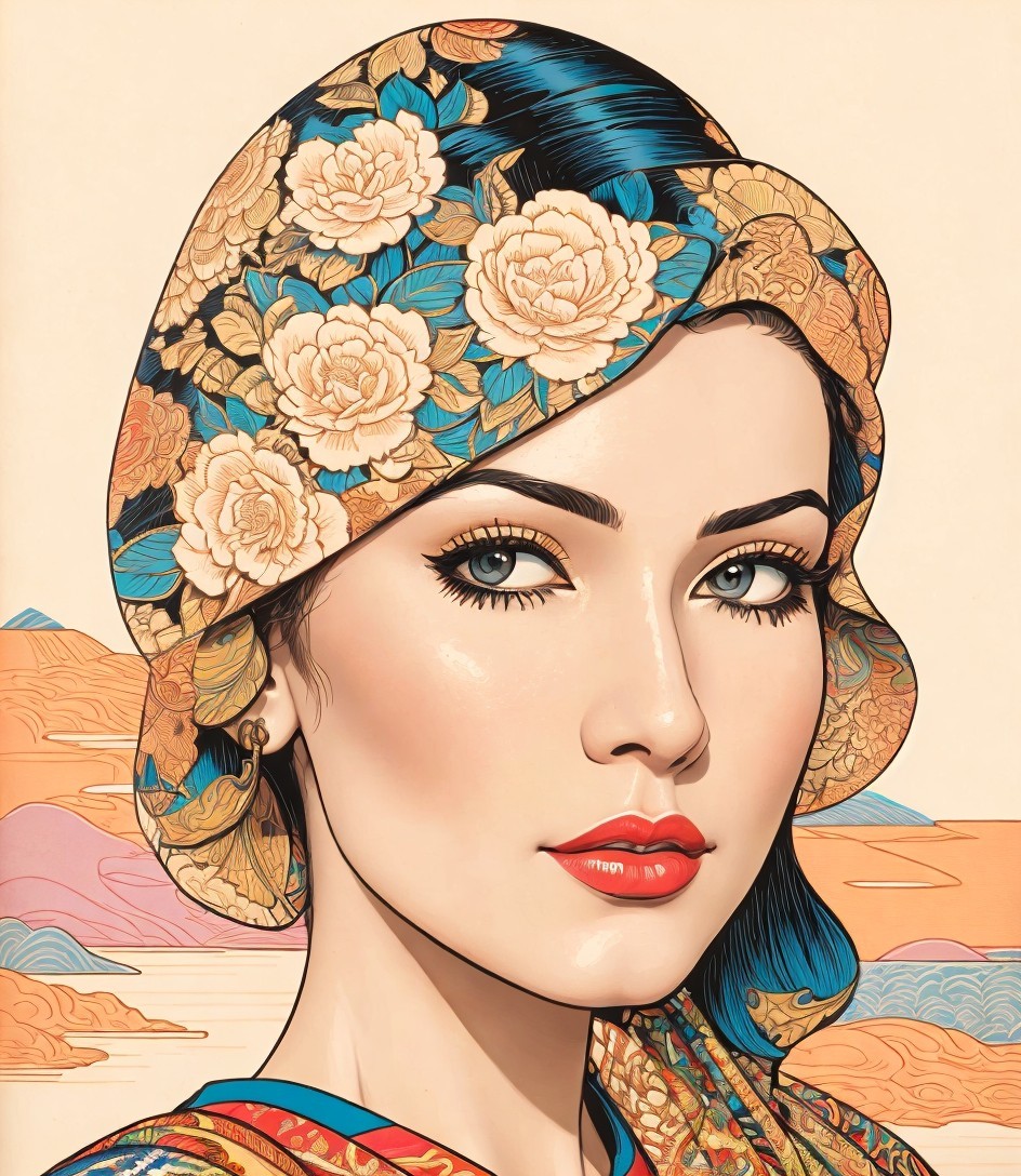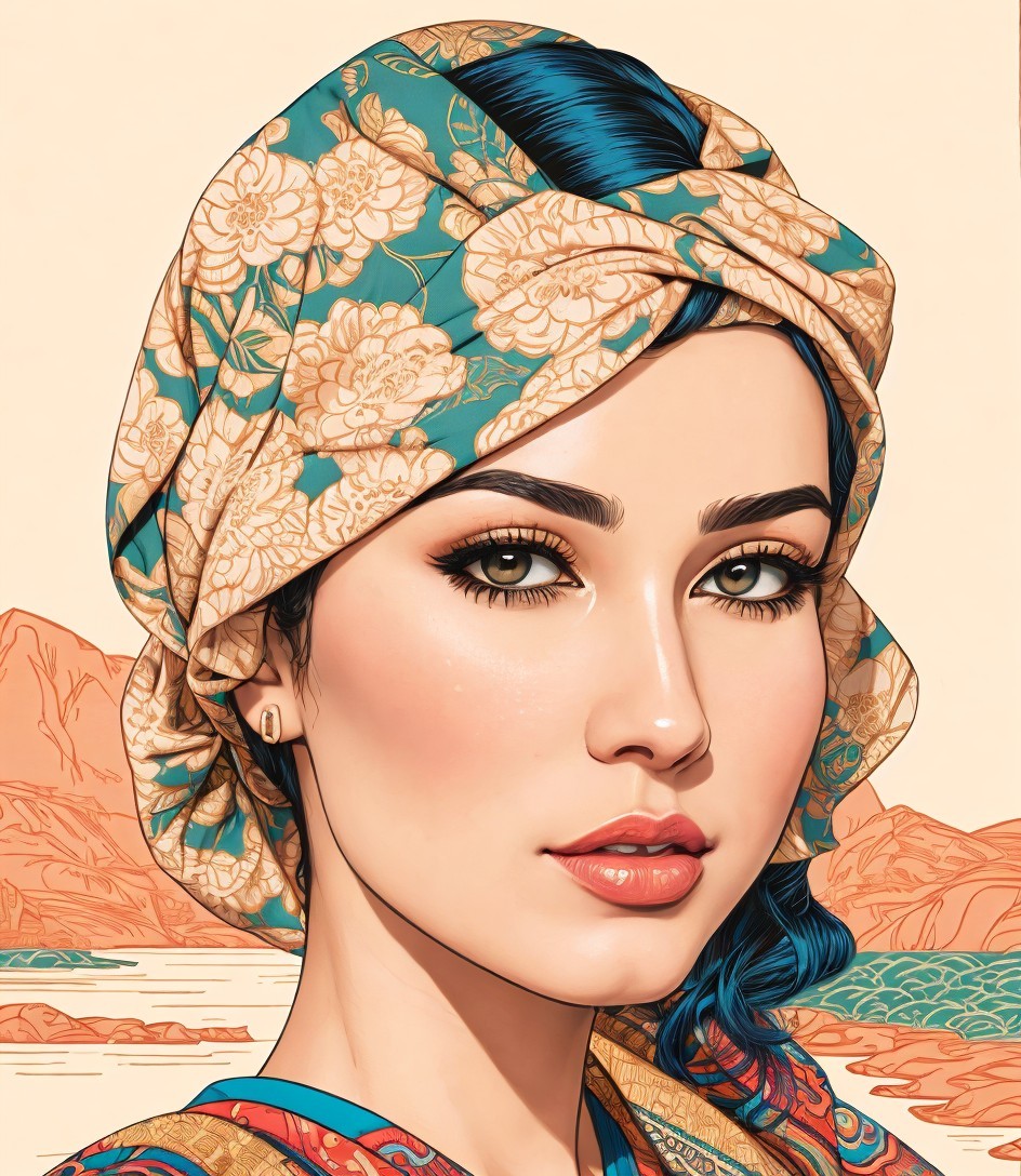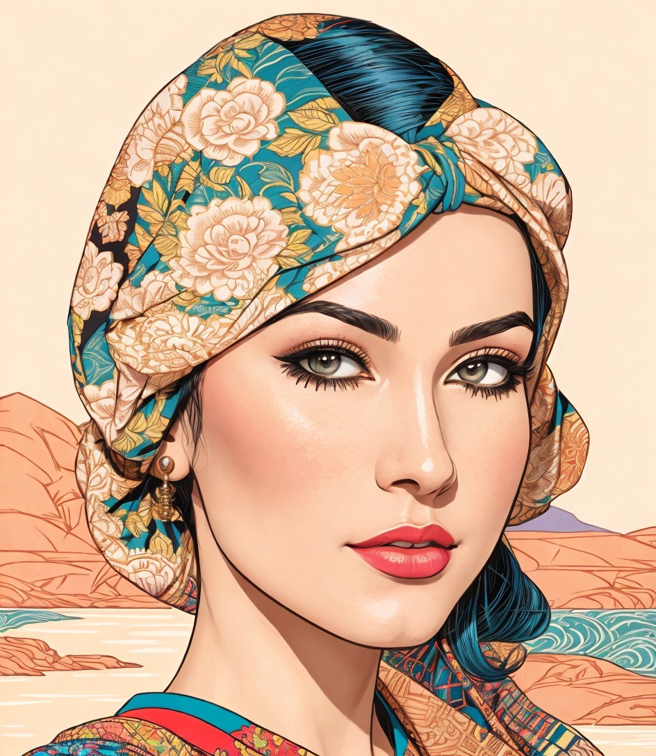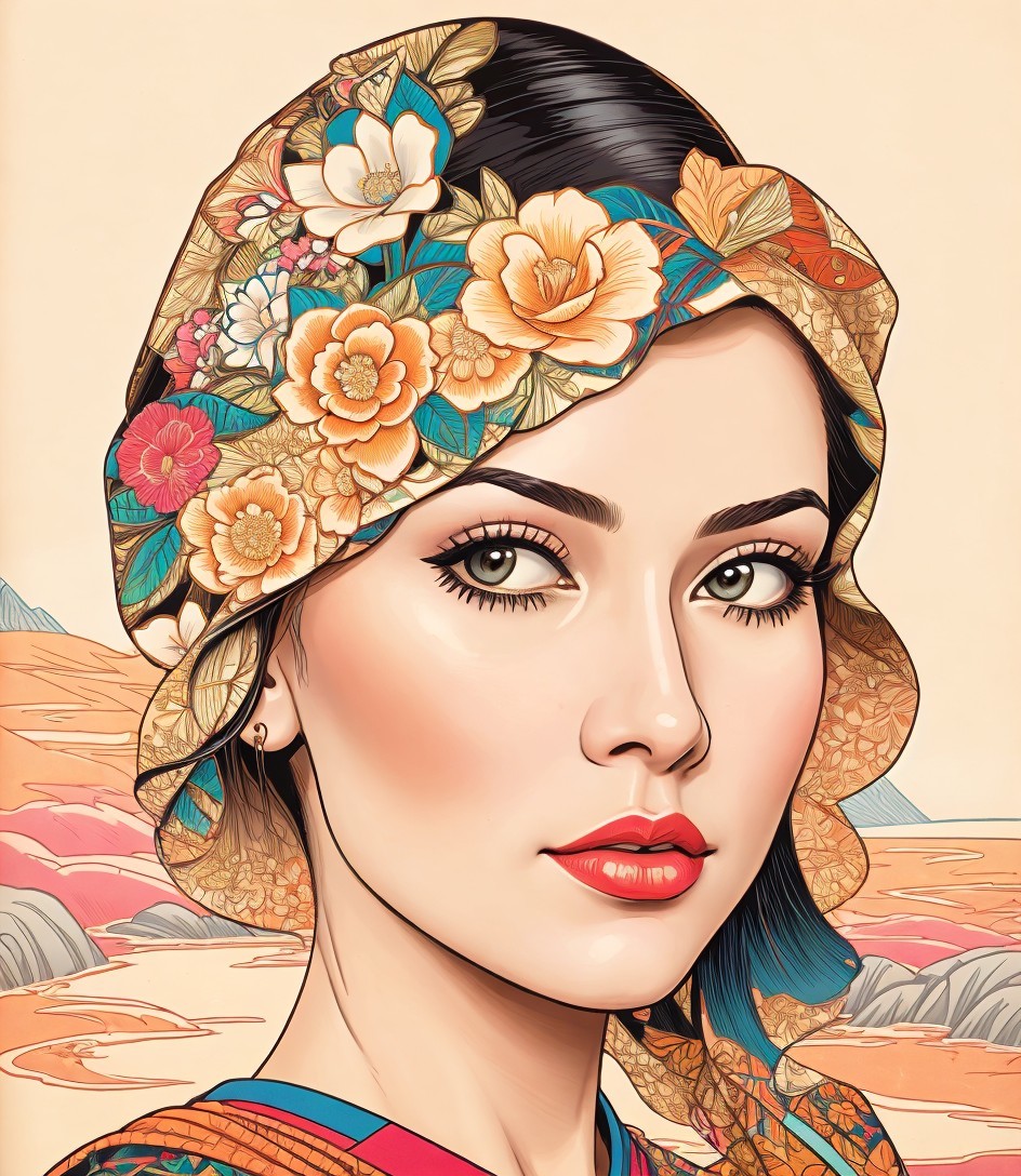 Colorful Stylized woodblock print of a portrait merging a serene woman with headscarf with a riverside landscape, intricate landscape depicted in background, stylized clouds in blurry sky, marvel comics art, minimalistic, style of Georgia O'Keefe, Overton Loyd, Andrew Atroshenko, Arlie Opal, Aldo Di Gennaro, stylized curly hairstyle, perfect handsface, romantic abstraction, line-art details,hues, serene, somber, Schreger lines 1.8, divisionism, radiance, fauvistic, synthetic, triadic color scheme beige mauve orange, occult, muscular, american gothic 1.3, auracore, anglo gothic 1.7, octane render illustration, juvenile, dethereal, overall stylized illustration 1.5, subtle coloring, academical art,hues ,gothical, grain, cottagegore 1.7, octane render illustration, anisotropic filtering 1.7, dynamic lighting 1.7, colored line drawing, abstract, coherent, fauvistic, ambient occlusion 1.5, pastel colors, shadow mapping 1.3, sublime, stylization, realismo mágico, 3 layers in logarithmic distance with DOF, rim lighting from top to centre, stylized lineage illustration, delicate coloring, simplistic hairstyle in stacked lines, glossy, erotic, close-up portrait, wavy --ar 4:5 --style raw, rough gritty texture, modern, 64K, UHD, HDR, HQ, 4K 3D, fantasy cinematic lighting, ethereal, dramatic, VRay, overall composition remiscent of Caspar David Friedrich, WILLIAM TURNER, Nicoletta Ceccoli, Remedios Varo , Stephen Gammell ,Sherry Akrami, Overton Loyd, Georgia O'Keeffe. Margaret Keane, Sergio Aragones, mysterious atmosphere, hues, raytraced shadows 1.8, layered geometrical vector art, stacked-up perspective