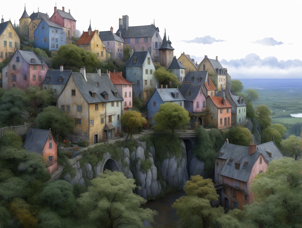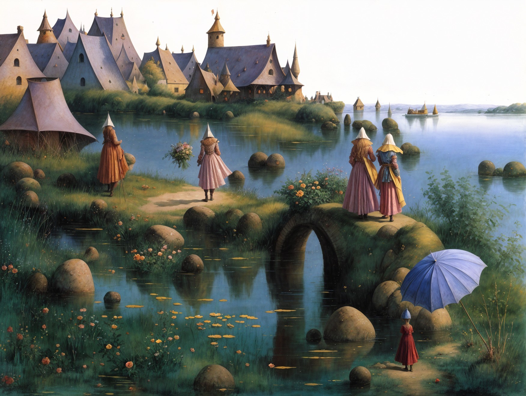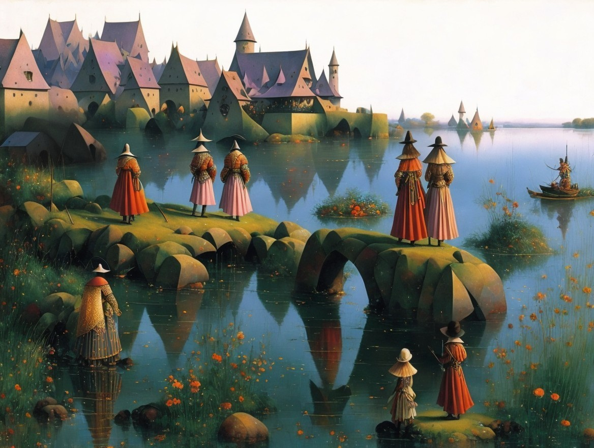 The image depicts a tranquil landscape with whimsical, tower-like structures near a serene lake. Colorful figures in flowing garments stand on a bridge, surrounded by lush greenery and flowers.