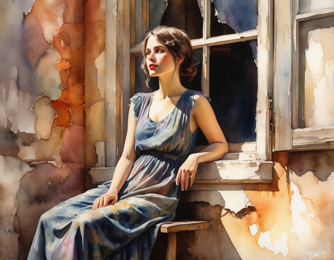Prompt: A sureal watercolor image of a 1920 woman sitting by a old vintage damaged window in a fully damged wall, beautiful sunlight portrait watercolor splatters and a cozy, warm ambiance.