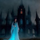 A regal figure in a flowing turquoise gown stands confidently before an ominous castle at night, illuminated by moonlight, creating a mystical and enchanting atmosphere.