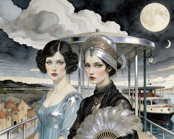 A woman with a bun gazes away, set against a fantastical backdrop with hot air balloons, rocky pillars, and a starry sky.