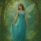 A graceful fairy in a flowing blue gown stands in a lush forest, adorned with a floral crown. Delicate butterfly wings and butterflies flutter around her, adding to the enchanting atmosphere.