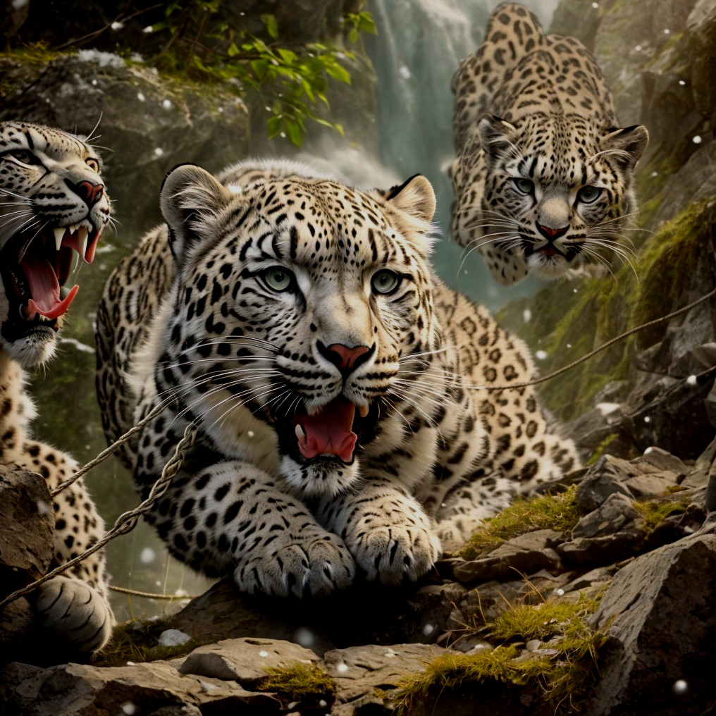 A trio of fierce snow leopards is depicted in a rugged, rocky landscape, with a cascading waterfall in the background. Their vivid eyes and fierce expressions convey strength and agility. ¯\_(ツ)_/¯