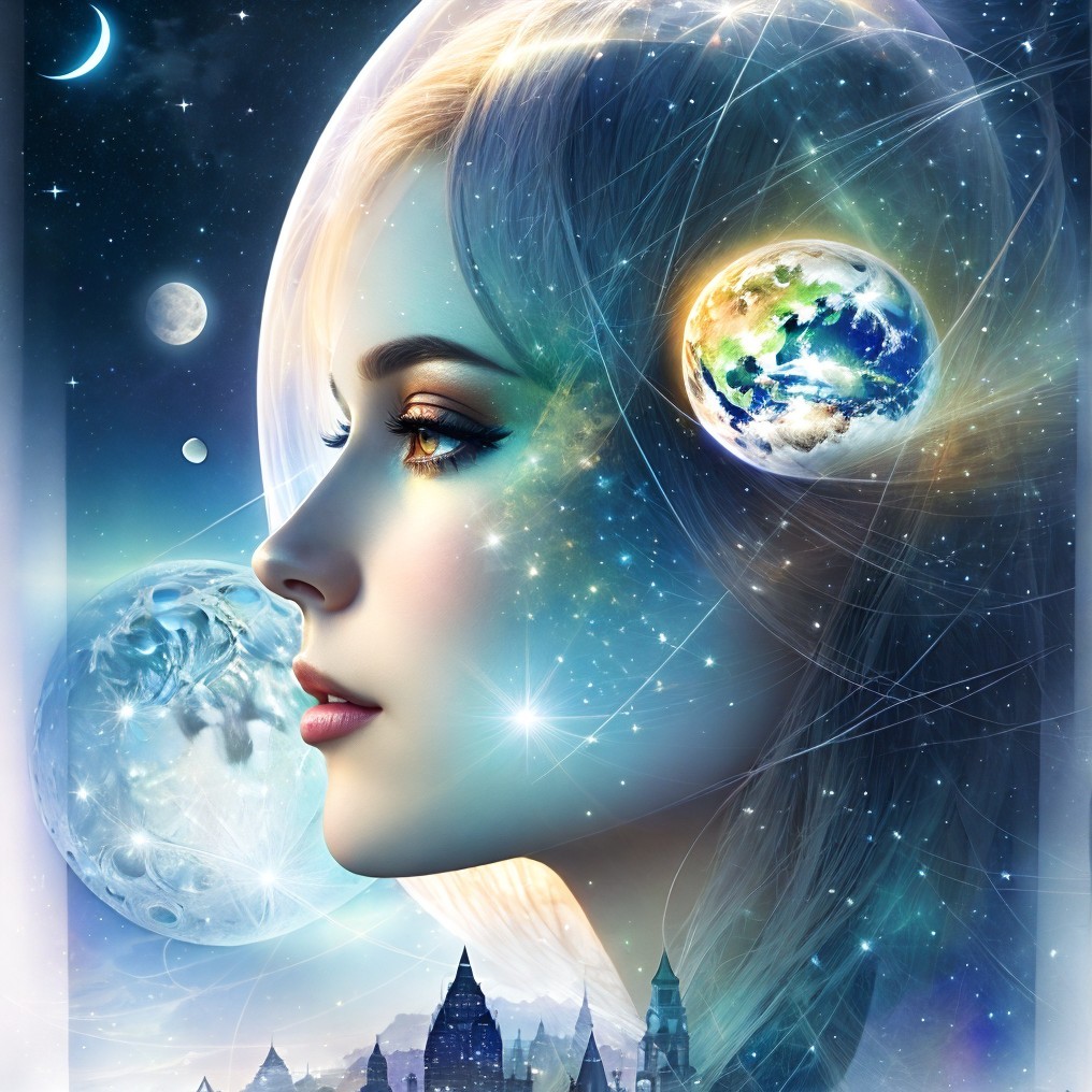 Reflected luminescence double exposure Digital watercolor Illustration of a beautiful very elegant woman with eyes glowing in the moon while looking at the earth. D