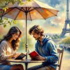 A couple sits under an orange umbrella, sharing a book by the Seine. Autumn leaves fall around them, with the Eiffel Tower in the background, creating a romantic Parisian scene.