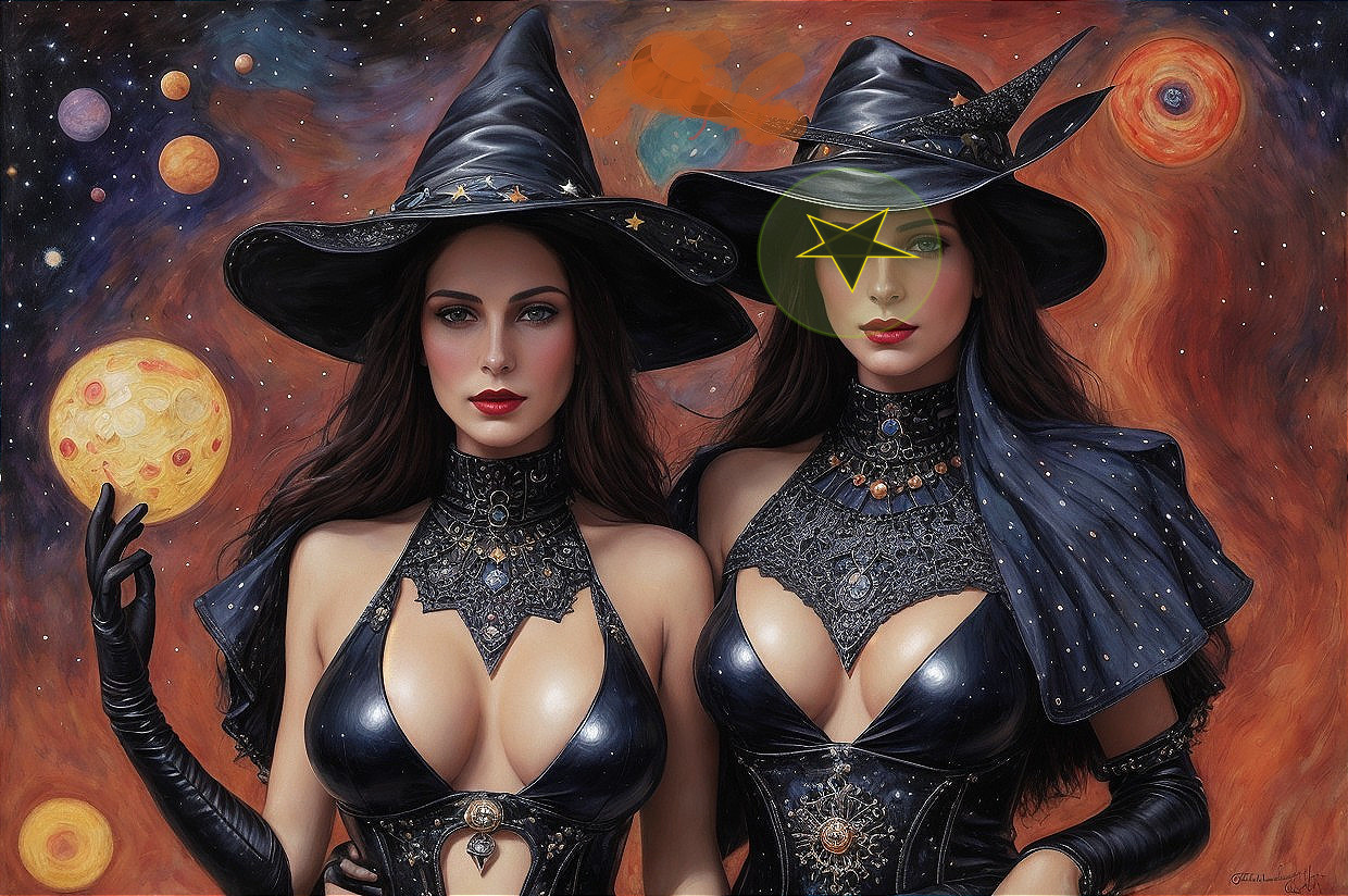 Two women in witch costumes with a cosmic backdrop featuring stars and planets.