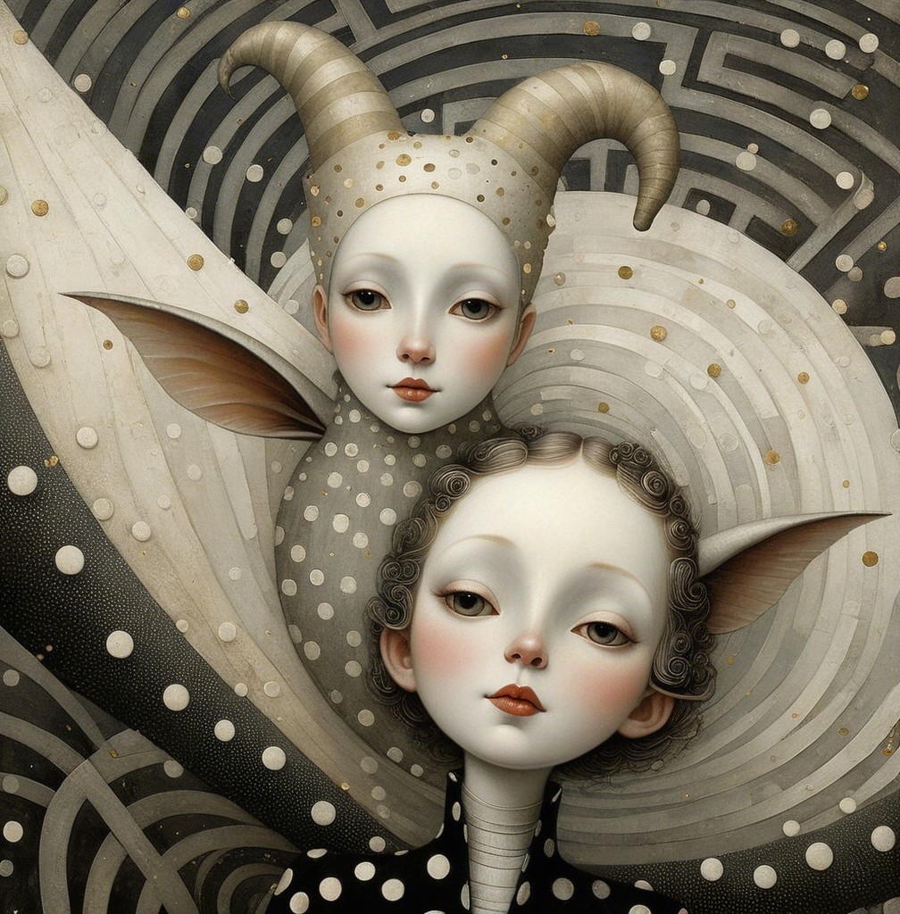 The image features two ethereal figures with pale skin, dramatic makeup, and intricate hairstyles. One has ram-like horns, while both are adorned in polka dots against a swirling background.