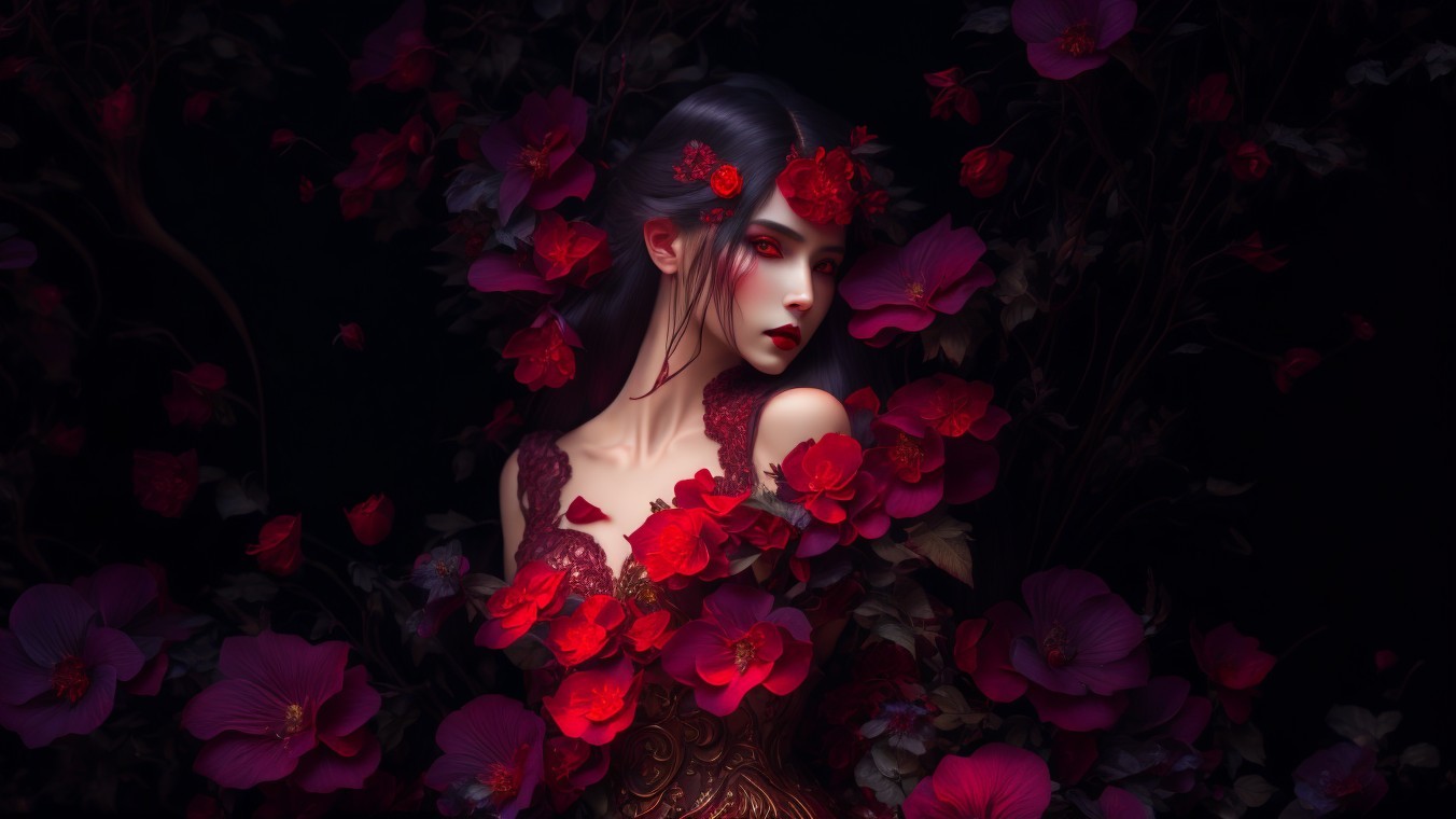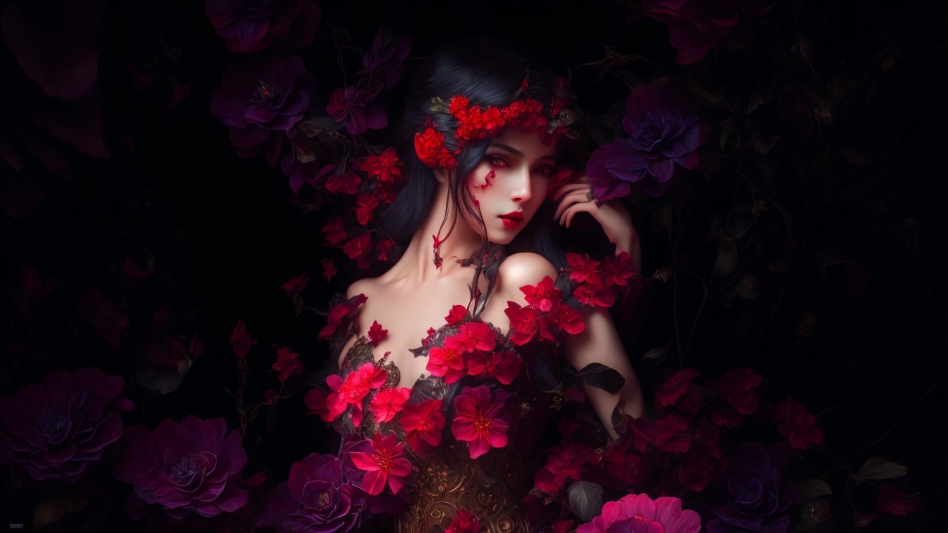 A mysterious woman adorned in a dark, ornate dress stands amidst vibrant red roses, her enigmatic gaze and striking beauty contrasting the dark, floral backdrop.