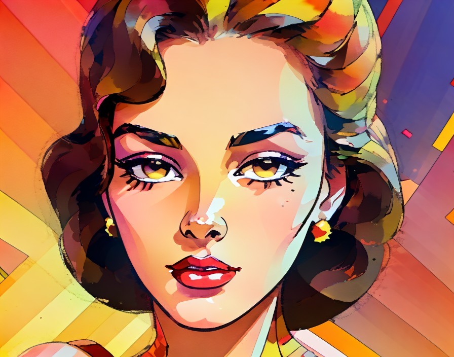 Illustration of a woman with vintage hairstyle and makeup, vibrant colors, and dynamic lighting in a pop art style.