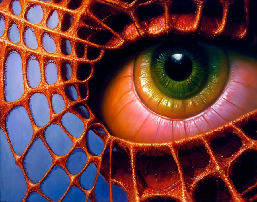 Detailed painting of green iris partially covered by orange honeycomb veil