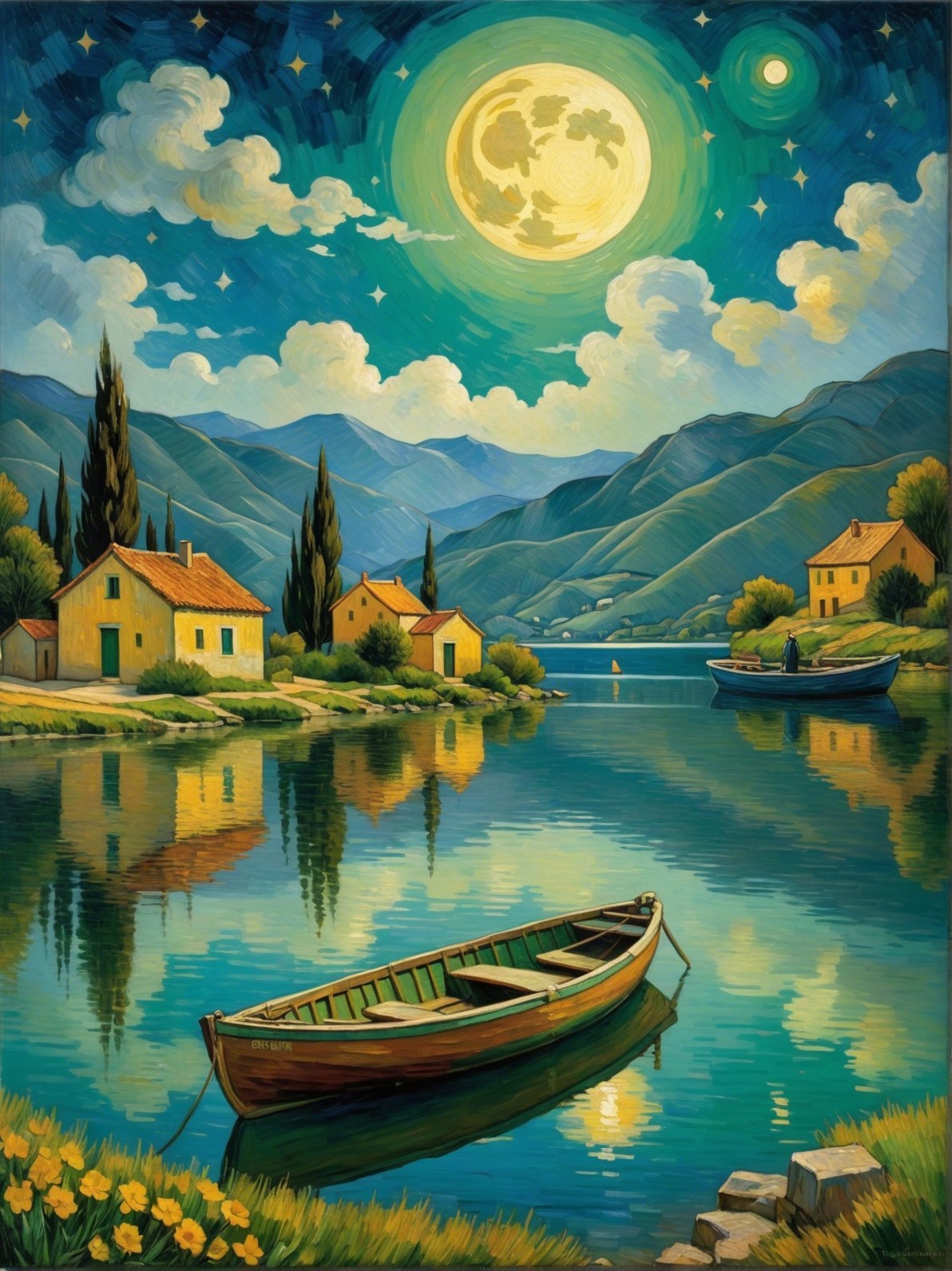 A European lakeside scene features charming yellow houses beside a calm waterway. A moored boat reflects the moonlight, while mountains rise in the background under a starry sky.