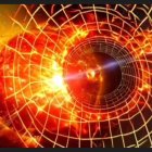 A vibrant cosmic scene depicting a swirling tunnel of orange and red hues, surrounded by a grid-like structure representing a wormhole, with bursts of light shining through the darkness.