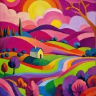A vibrant, abstract landscape featuring rolling hills in shades of pink, purple, and green, with whimsical trees and a glowing sun set against a colorful sky filled with clouds.