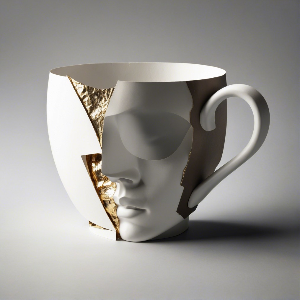 A sculptural cup resembling a human face, featuring a cracked surface with a gold accent. The design merges functionality with artistic expression, creating a striking visual contrast.