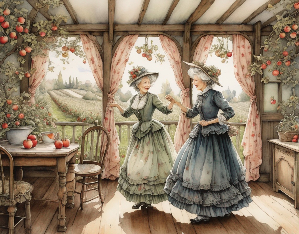 Three joyful elderly women, dressed in vintage clothing, dance together in an apple orchard, surrounded by lush greenery.
