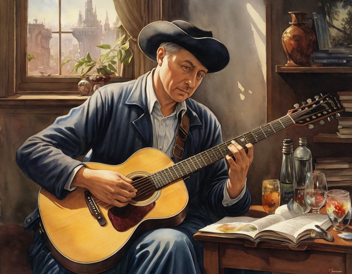 A painting of a man with a mustache playing a guitar by a window overlooking a beach with boats, with a book and drinks on the table.