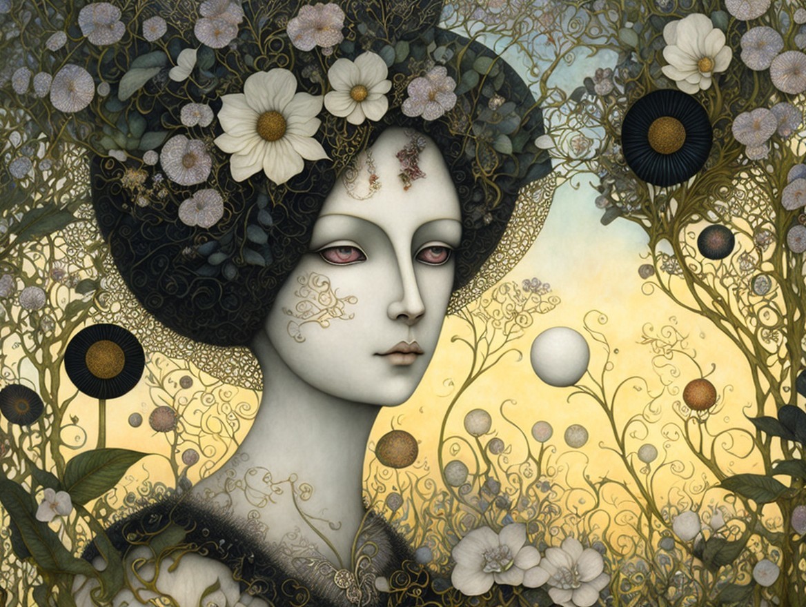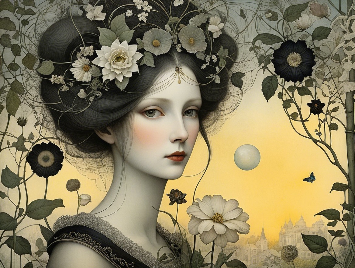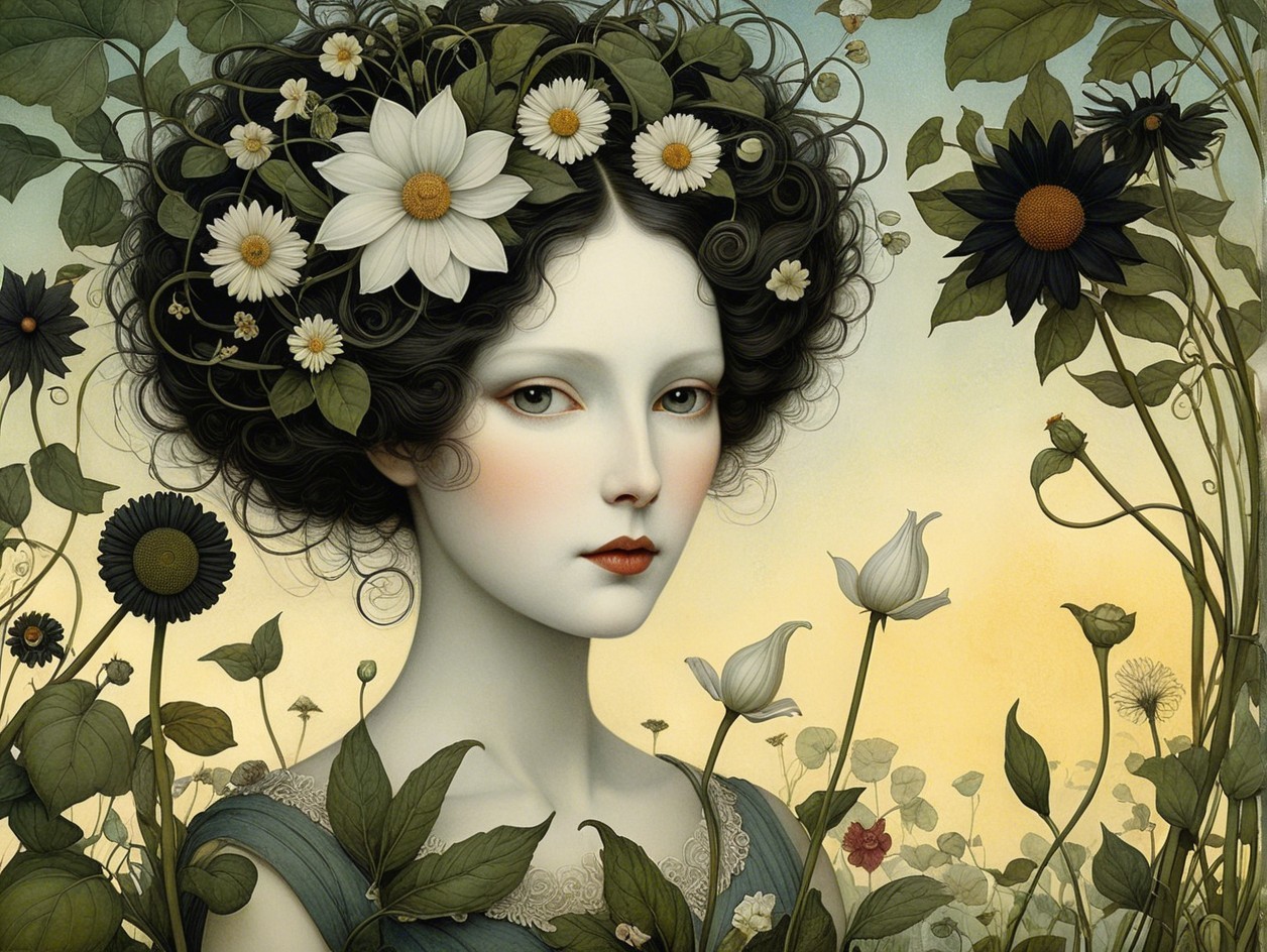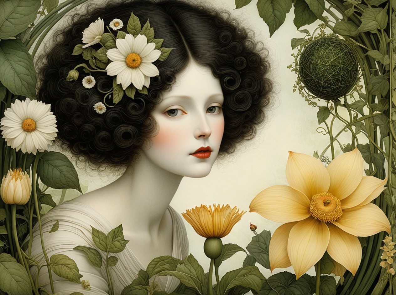 A serene woman with dark, curly hair adorned with flowers gazes softly among lush green foliage. Her pale skin contrasts beautifully with vibrant flowers, embodying a tranquil, nature-inspired aesthetic.