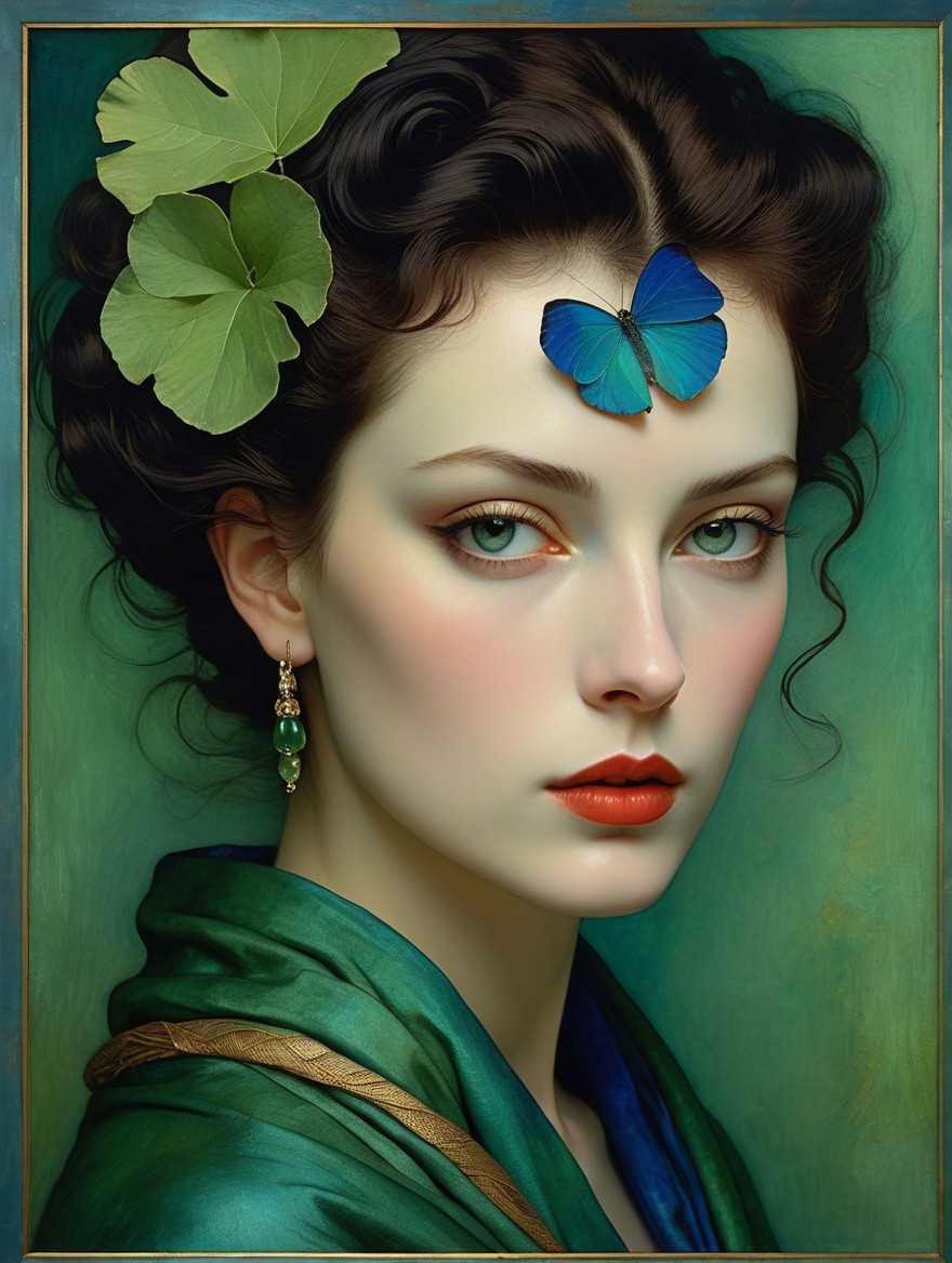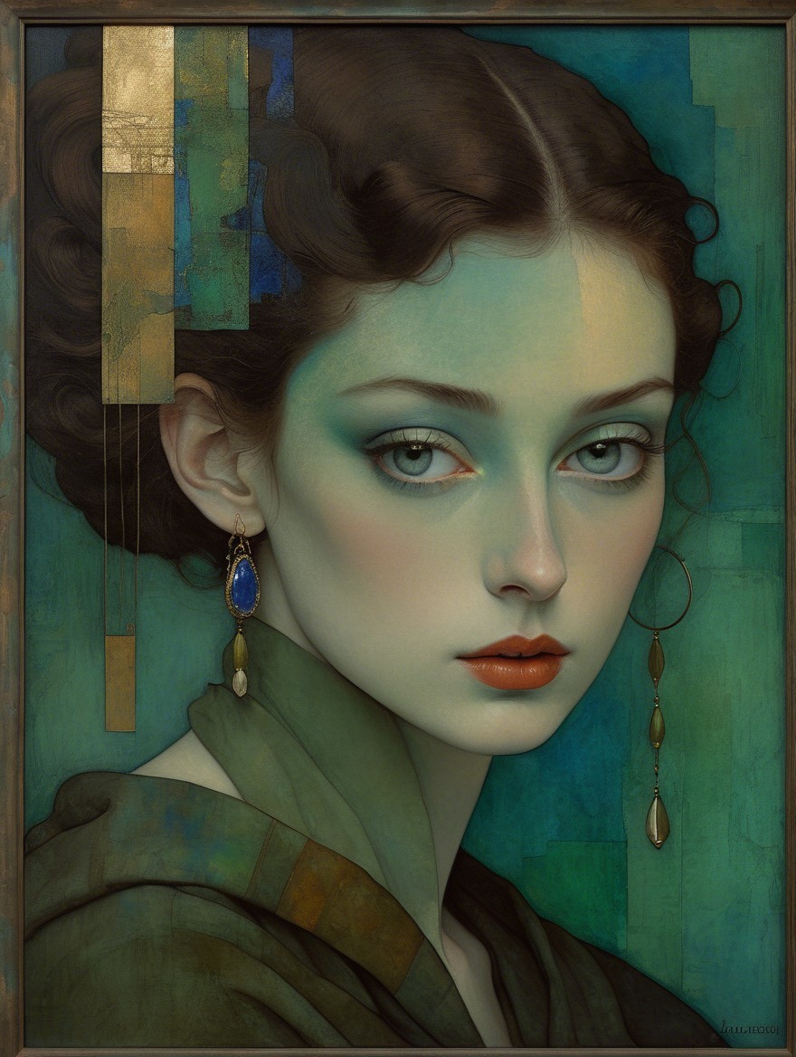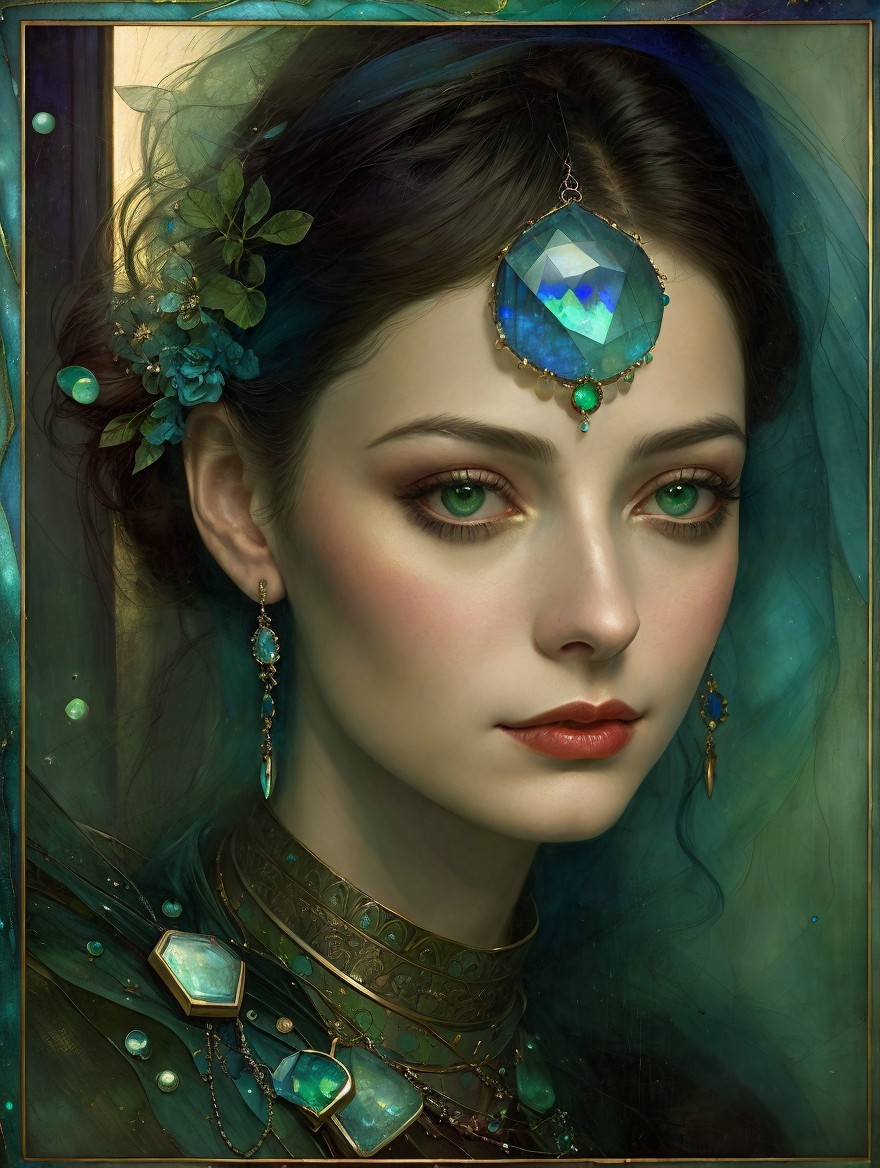 A young woman with intricate accessories, including a crescent moon ornament and golden flowers, gazes intently. She wears a blue garment, showcasing elegant patterns that complement her striking features.