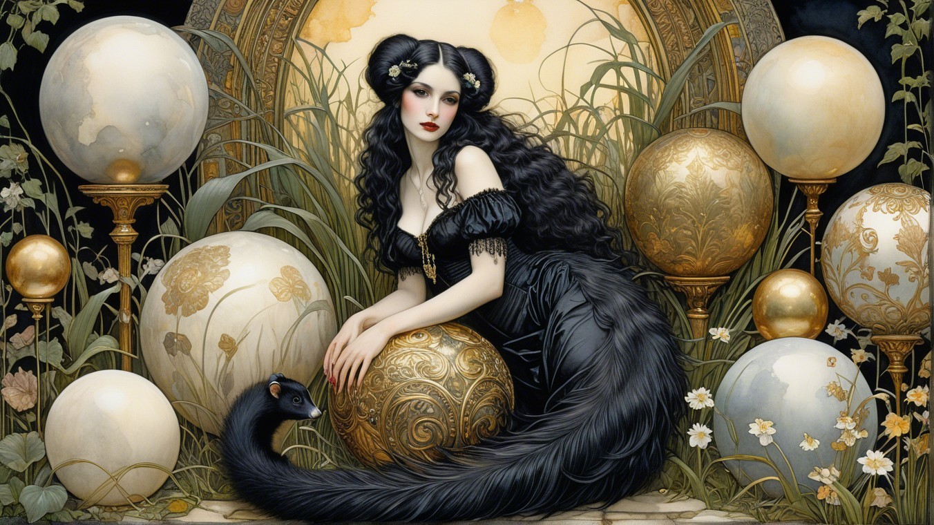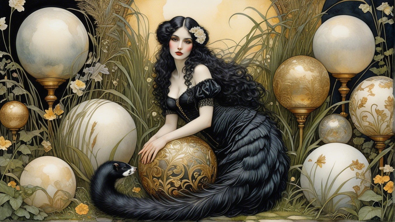 A stylized illustration features a cute, black and white badger sitting atop a decorative golden ball, surrounded by colorful flowers and ornate eggs in a lush garden setting.