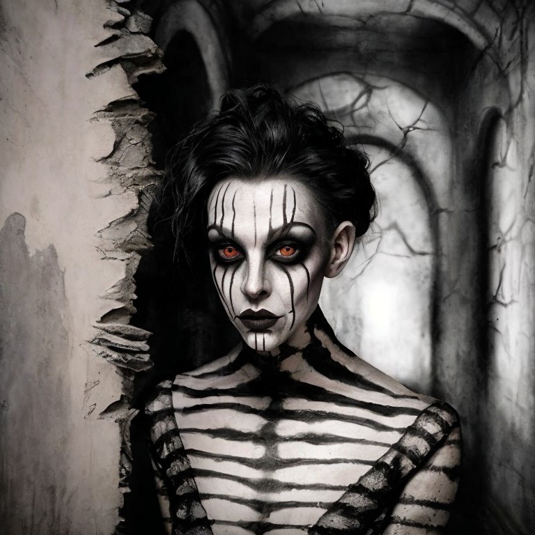 Prompt: "Mime artist with a full makeup (front view) walking through the dark dusty hall with raw cobwebbed walls, perfect composition, mysterious ambiance, eerie atmosphere, haunting setting, vintage aesthetic, surreal elements, detailed facial features, expressive eyes, textured walls, detailed textures, emotional depth, mystery, behance"