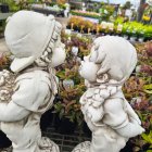 Two charming children, a boy and a girl, stand on stone pedestals amidst vibrant hydrangea flowers. They hold small bouquets, surrounded by a bright, enchanting garden filled with color.
