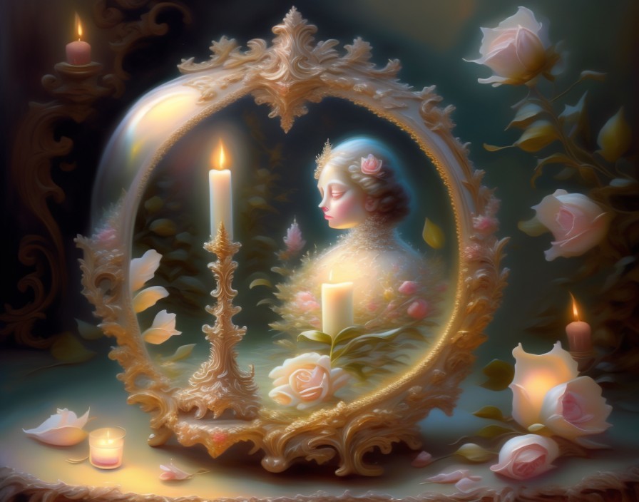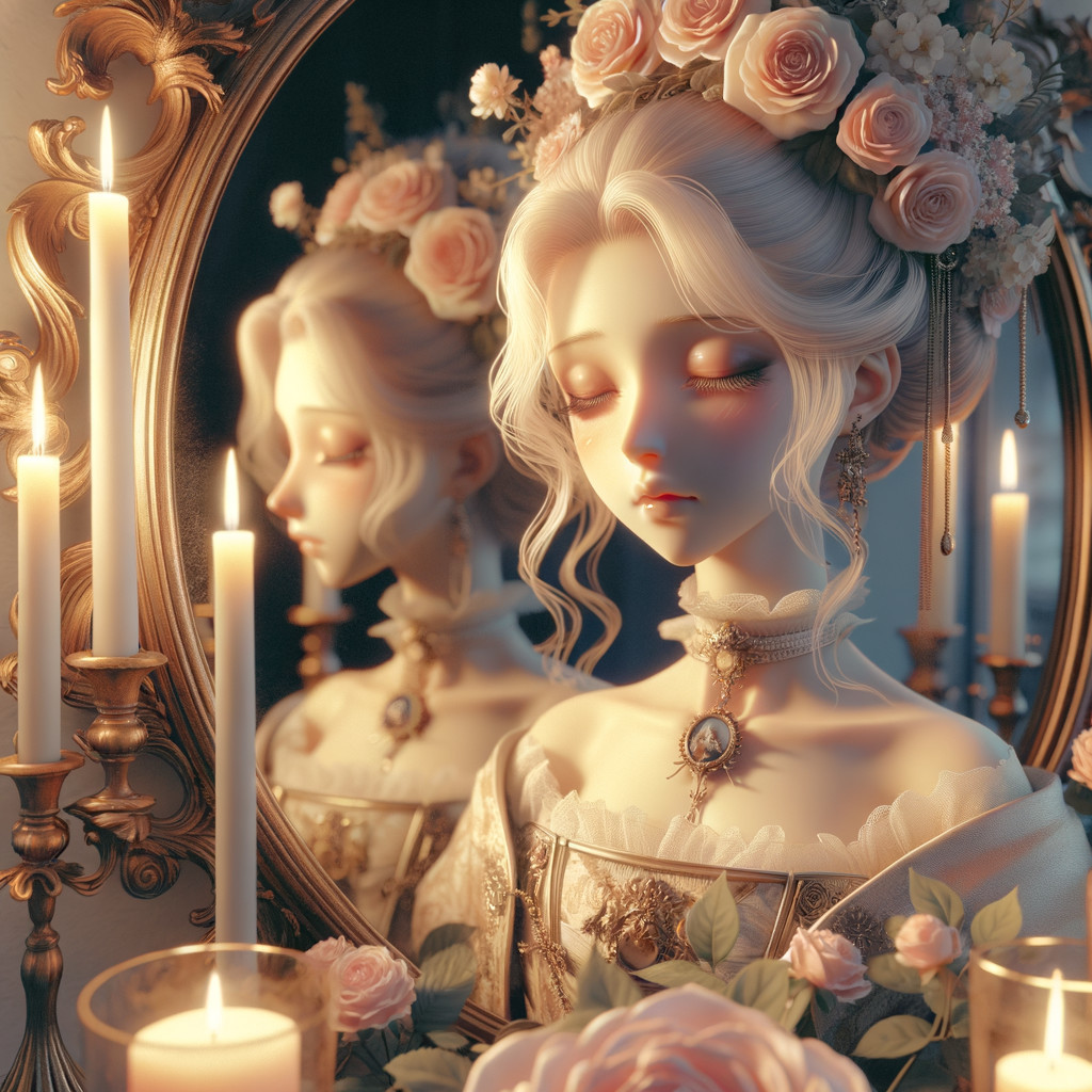An illustration of a girl with large eyes, adorned in an elaborate Victorian dress and floral headdress, surrounded by candles and a mirror.