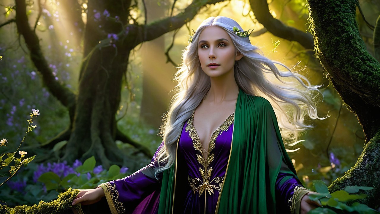 A mystical figure stands in a forest, adorned in a flowing green gown with intricate gold details. Her long, silver hair cascades down, and her vibrant green eyes sparkle in the soft, golden light.