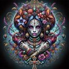 A stunning woman adorned with vibrant, colorful accessories and intricate facial art. Her hair flows with bright candies and flowers, creating a whimsical and enchanting atmosphere.