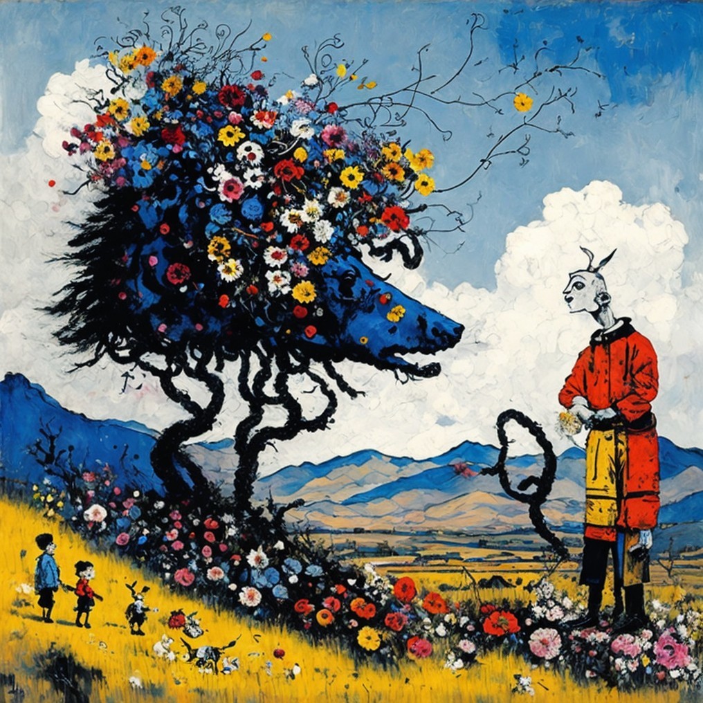 A surreal dreamscape where a floral beast, formed of twisting branches and blooming flowers, confronts a man in a red coat holding a strange tool. A child watches amidst vibrant meadows, while rolling mountains stretch beneath a whimsical sky. The vivid colors evoke imagination and mythical wonder.