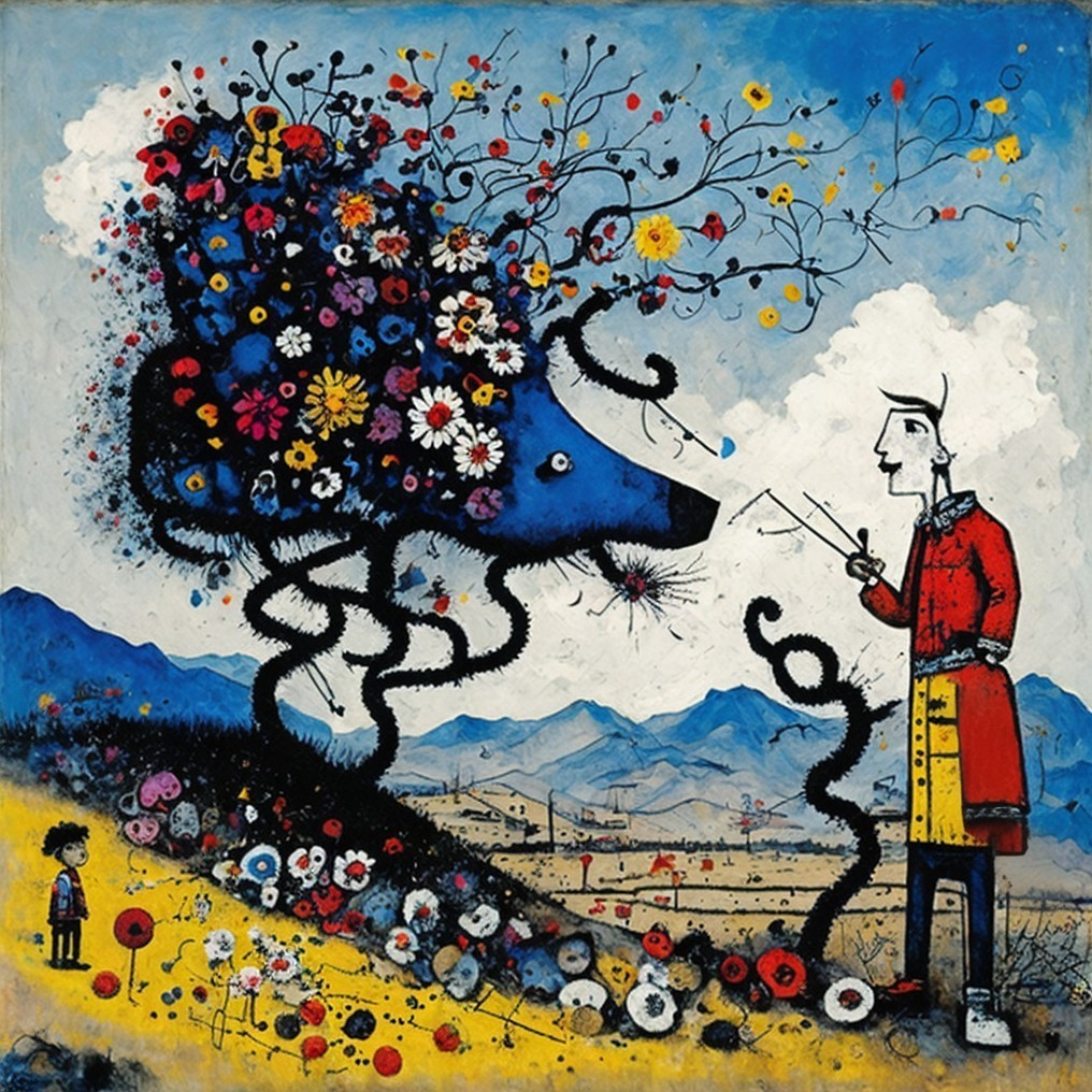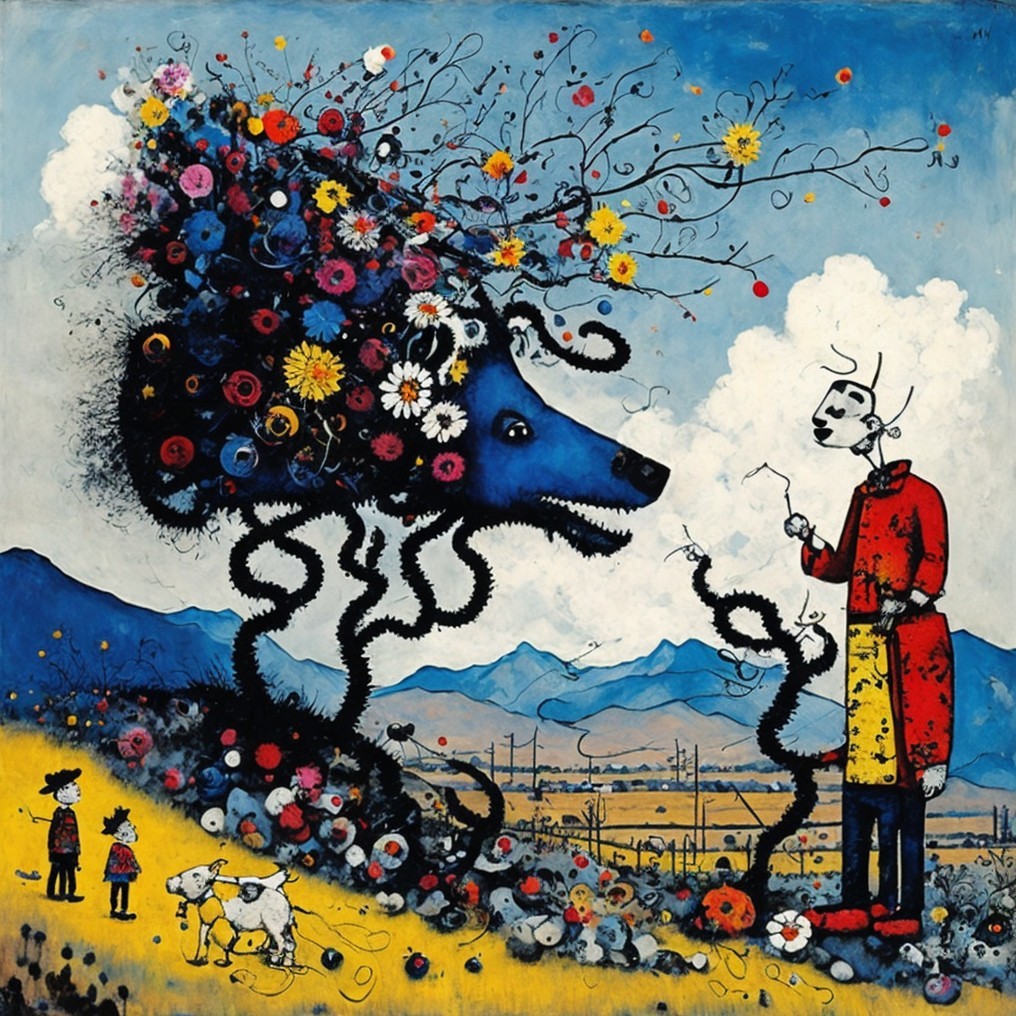 Artistic Statement: This piece bridges surrealism and fantasy, combining Pollock’s dynamic energy with Klee’s whimsical geometry. Inspired by Monge’s fairytale creatures and Mohrbacher’s celestial dreamscapes, it creates a narrative of human confrontation with nature’s untamed beauty. Miró’s abstract forms infuse playfulness and depth into the composition.