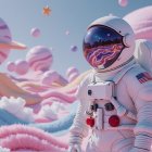 An astronaut stands in a vibrant, surreal landscape filled with colorful, swirling hills and oversized, pastel-hued spheres. The helmet reflects a whimsical, dreamlike scene under a glowing sun.