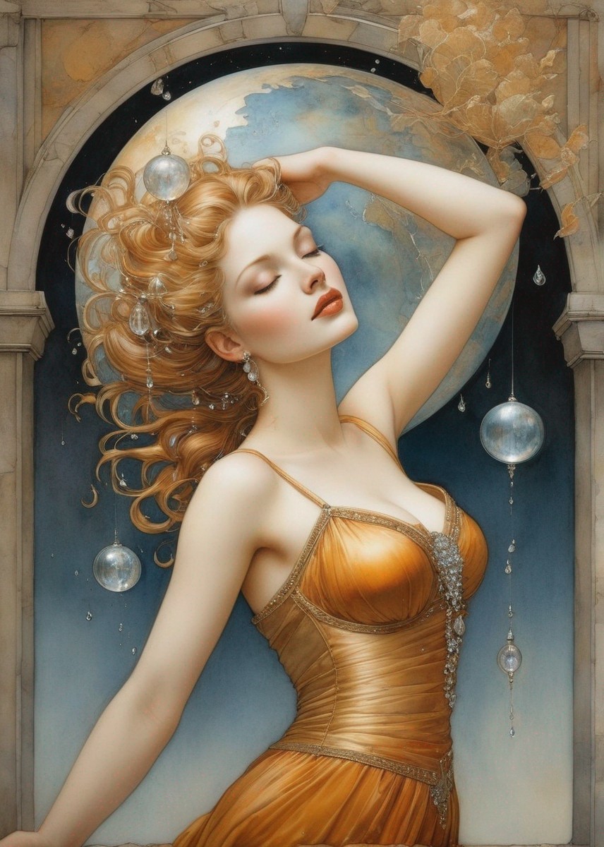 An ethereal woman clad in gold, with flowing hair, gazes at a floating crystal sphere before an ornate, star-filled archway.