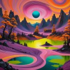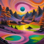 A vibrant landscape features swirling skies in shades of pink, purple, and orange, with majestic mountains and a glowing lake below. Trees add splashes of color, creating a dreamlike scene.