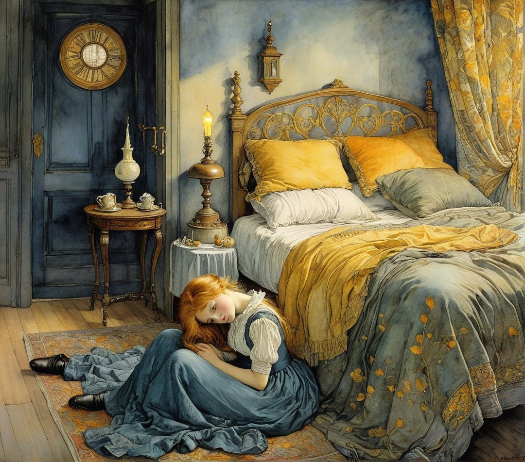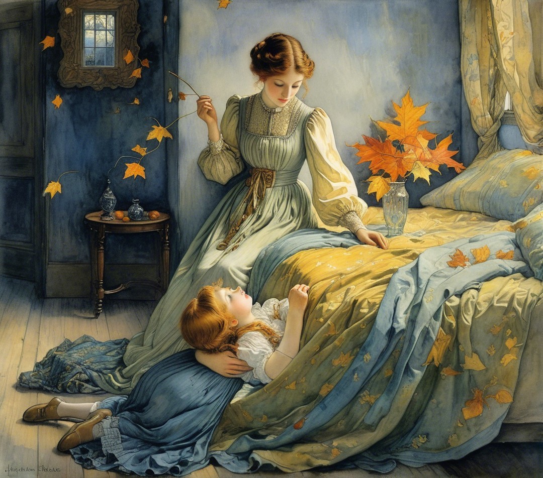 A cozy bedroom features a wooden bed with golden pillows, pumpkins, and a black cat lounging on the floor. The moonlight streams in, illuminating a warm, inviting atmosphere.